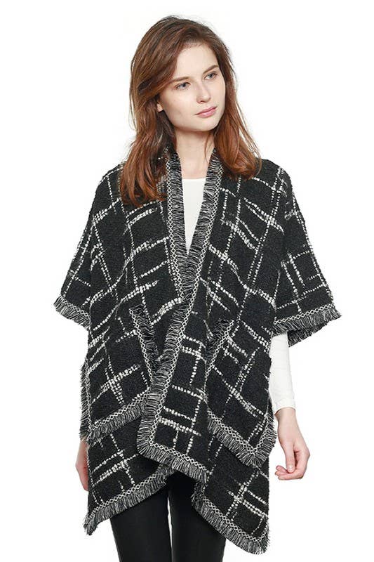 Poncho cape ample avec silhouette ouverte, ourlet plié et motif méandres clé grecque. - Dimensions : 160 cm x 120 cm - 100 % acrylique