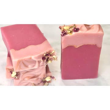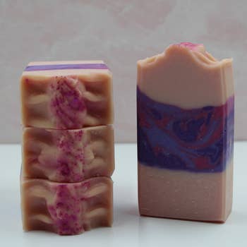 Un doux mélange parfumé de framboise mûre, de prune noire et de vanille chaude. Savon saponifié à froid, fabriqué à la main avec un mélange de beurres riches de cacao et de karité, d'huiles nourrissantes et de lait de chèvre frais pour un savon doux et durable avec une mousse crémeuse. Parfumé avec des huiles parfumées de qualité, sans phtalates. Chaque barre de savon pèse environ 4,5 onces. Pour de meilleurs résultats, utilisez un porte-savon drainant qui permet au savon de sécher entre les utilisations. Ingrédients : suif, huile d'olive, huile de coco, eau, hydroxyde de sodium, lait de chèvre, huile de ricin, beurre de cacao, beurre de karité, parfum, mica.