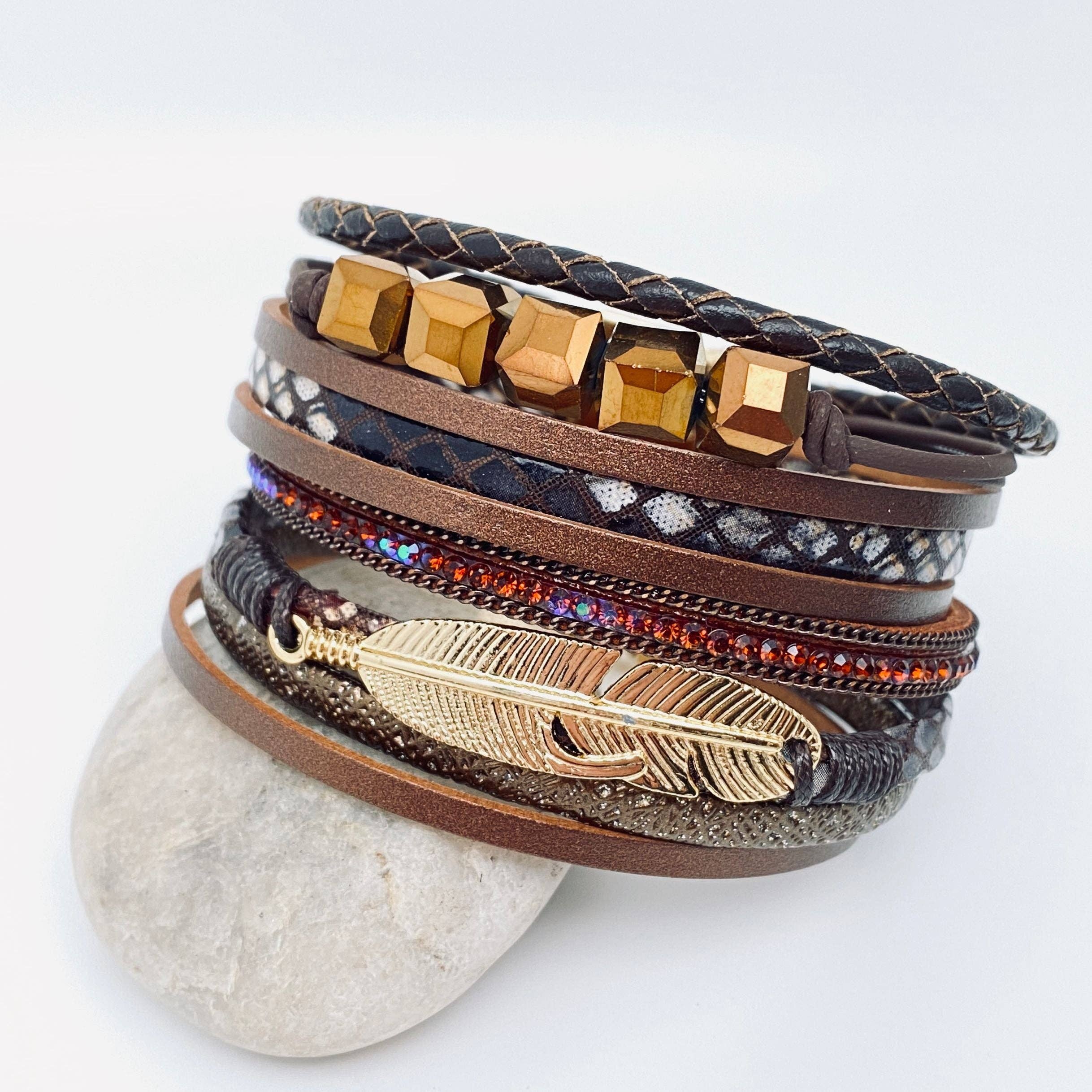 Détails : Cuir avec accents métalliques qui s'enroule deux fois pour un bracelet et une fois pour un ras-de-cou Mesures : 15 pouces Fermeture à crochet