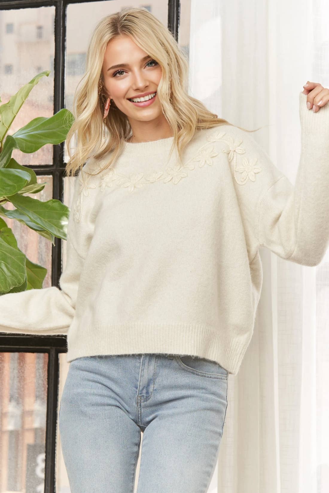 Un pull en maille uni à manches longues avec un col rond, orné d'un détail de point floral et d'une coupe décontractée. Le tissu est une maille légère. Le mannequin mesure 1,70 m et porte une taille Small. Taille du corps : Contemporain Motif : Uni Longueur : Manches longues Style : Col rond