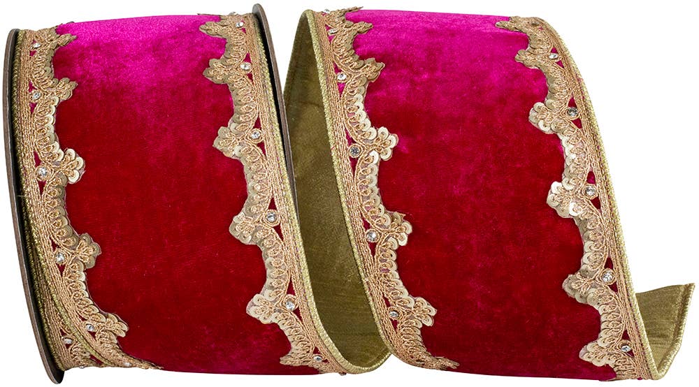 Bordure filaire Ribbon Velvet Royalty, rouge, 4 pouces, 5 mètres, teneur en fibres : 60 % viscose, 40 % polyester - Profitez de la riche texture du velours sans perdre de son éclat pendant les fêtes de fin d'année ! Ce ruban de velours à bordure dorée est parfait pour tous les projets de Noël. Le bord filaire permet à vos nœuds de conserver leur forme.