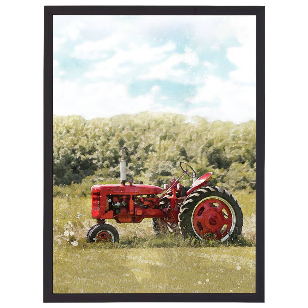 Grange rouge, étoile blanche, tracteur JD, arbres, effet pailleté. Cadre : brun rustique.