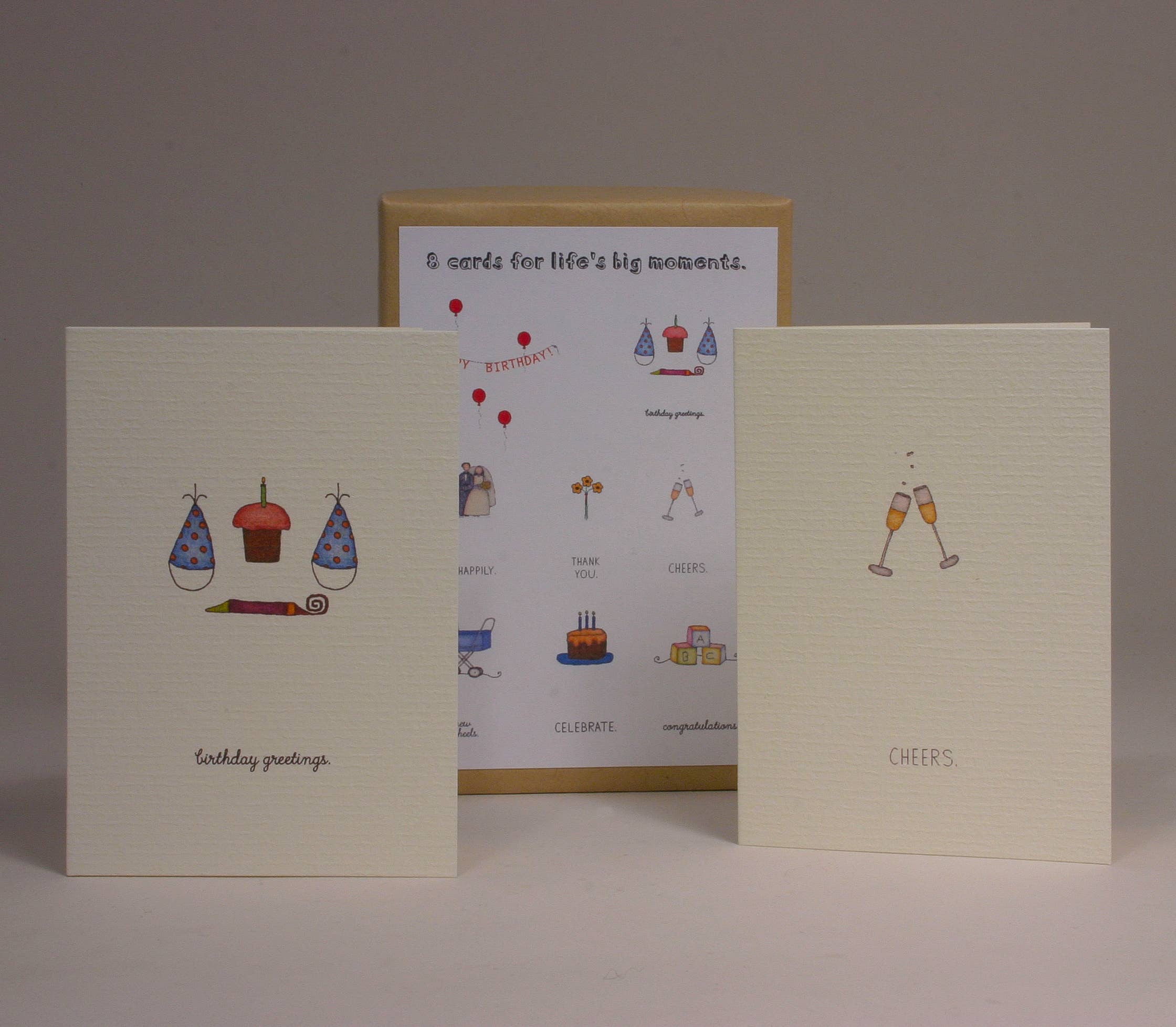 Processus : imprimé Taille de la carte : pliée 4 1/2 po L x 5 1/2 po H Taille de la carte : pliée 3 1/2 po L x 5 po H Papier : papier cartonné #110 Couleur : blanc crème Taille de l'enveloppe : A2, 4 barres Couleur de l'enveloppe : blanc crème Quantité : 12 cartes assorties pour de nombreuses occasions
