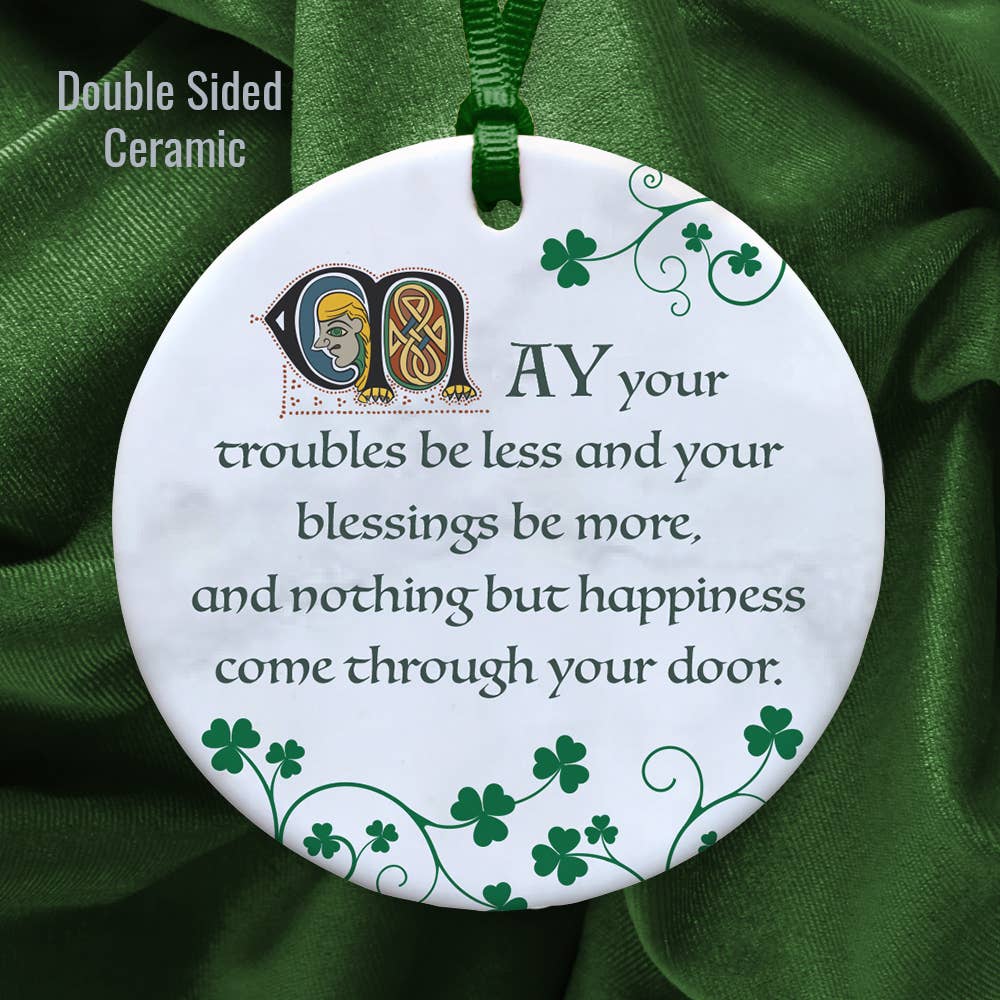 Ornement céramique double face présenté dans une boîte cadeau de luxe avec rabats en tissu à l'intérieur. Livré avec un ruban en satin, il est conçu pour être suspendu et exposé tout au long de l'année, et constitue un excellent cadeau. Le côté avant affiche l'inscription « An Irish Blessing », ornée d'une majuscule « i » illustrée dans le Livre de Kells, ainsi que d'un motif nœud de la Trinité. Ce symbole, d'origine païenne celtique, représente en christianisme la Sainte Trinité : le Père, le Fils et le Saint-Esprit. Les bords des deux faces de l'ornement sont décorés de branches de trèfle. Au verso figure une ancienne bénédiction irlandaise : « Santé et longue vie pour vous, Terre sans loyer pour vous, Un enfant chaque année pour vous, Si vous ne pouvez pas aller au Ciel, Que vous mouriez en Irlande. »