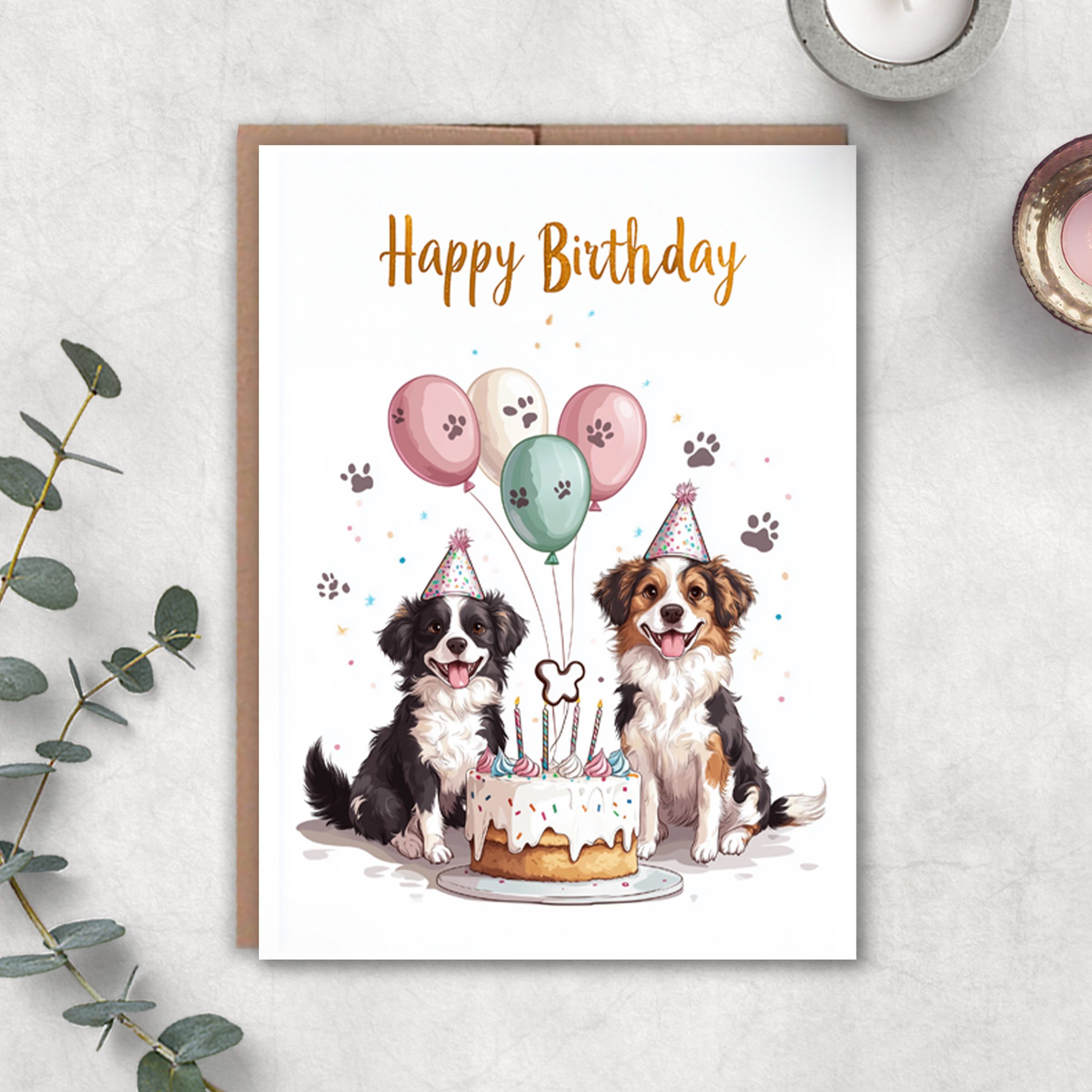 Carte d'anniversaire, intérieur vierge. Taille A2 : 4,25 x 5,5 pouces avec décorations en aluminium. Livré avec une enveloppe coordonnée et emballé dans une pochette transparente. Conçu avec soin par Carolyn Suzuki à Los Angeles, en Californie. Imprimé sur du papier certifié FSC neutre en carbone au Royaume-Uni. Image principale : chien, chiot, animaux de compagnie, kitsch