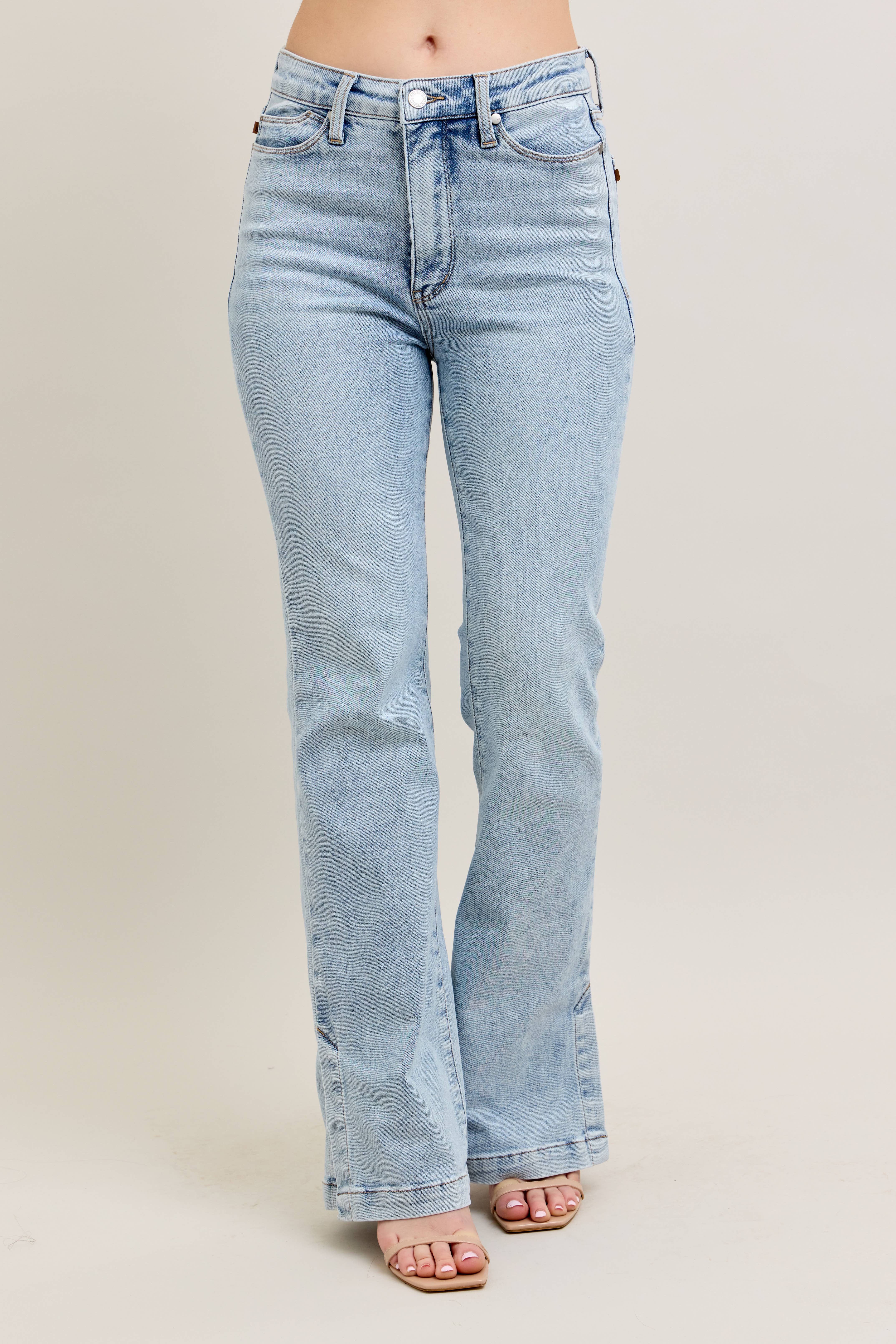 « ._ Pantalon en denim évasé à coupe courte et délavage moyen » en vente B2B