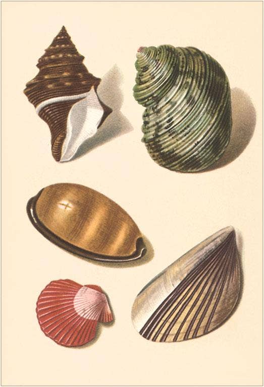 Un tableau de coquillages et mollusques d'Amérique du Nord, illustrés à la main, sert à la fois de carte postale et d'œuvre d'art encadrable. - Carte postale en carton épais de 5x7" - Impression mate - Imprimé en couleur intégrale