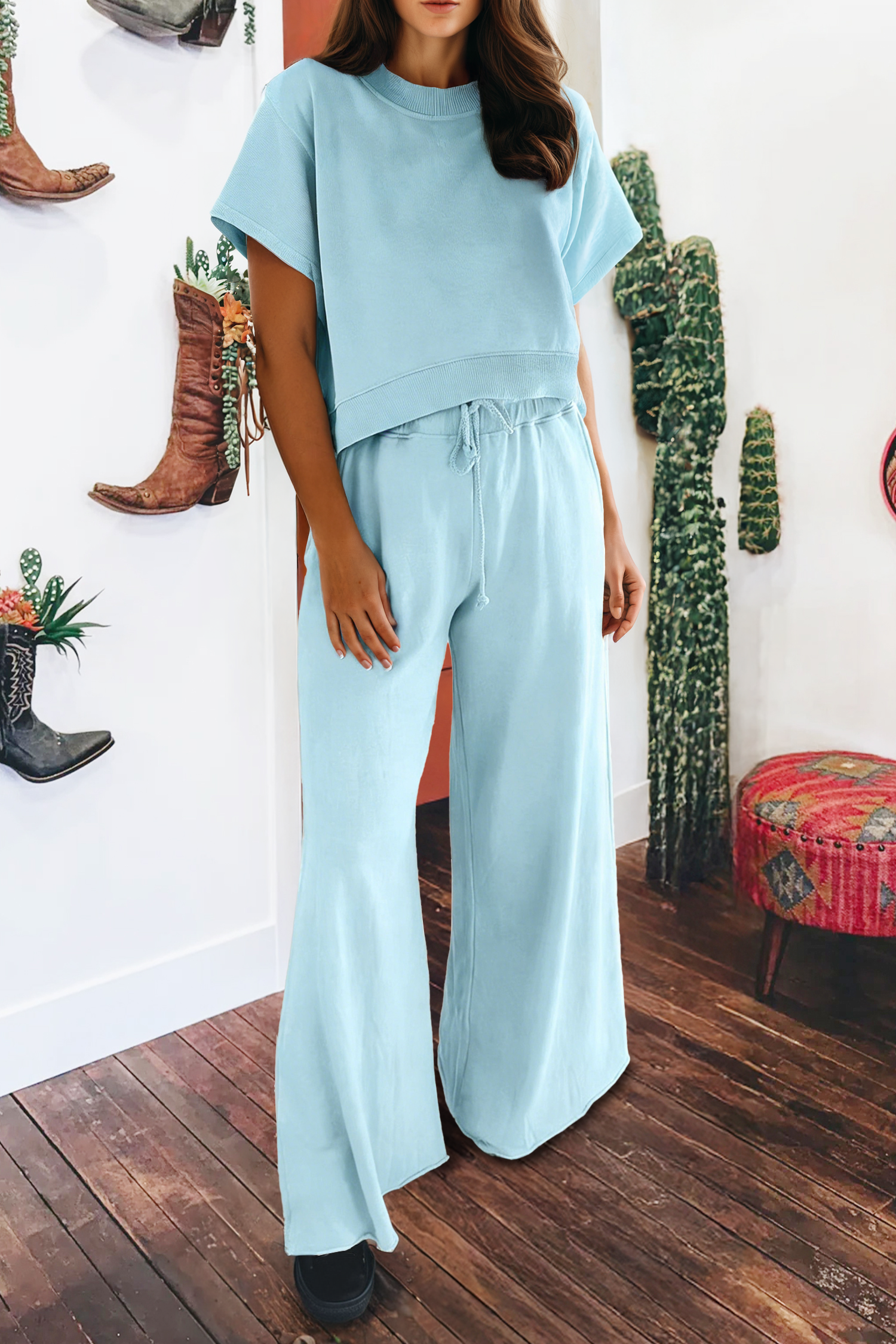 Ensemble deux pièces élégant à manches hautes et basses à manches longues et col rond de couleur unie en vente B2B