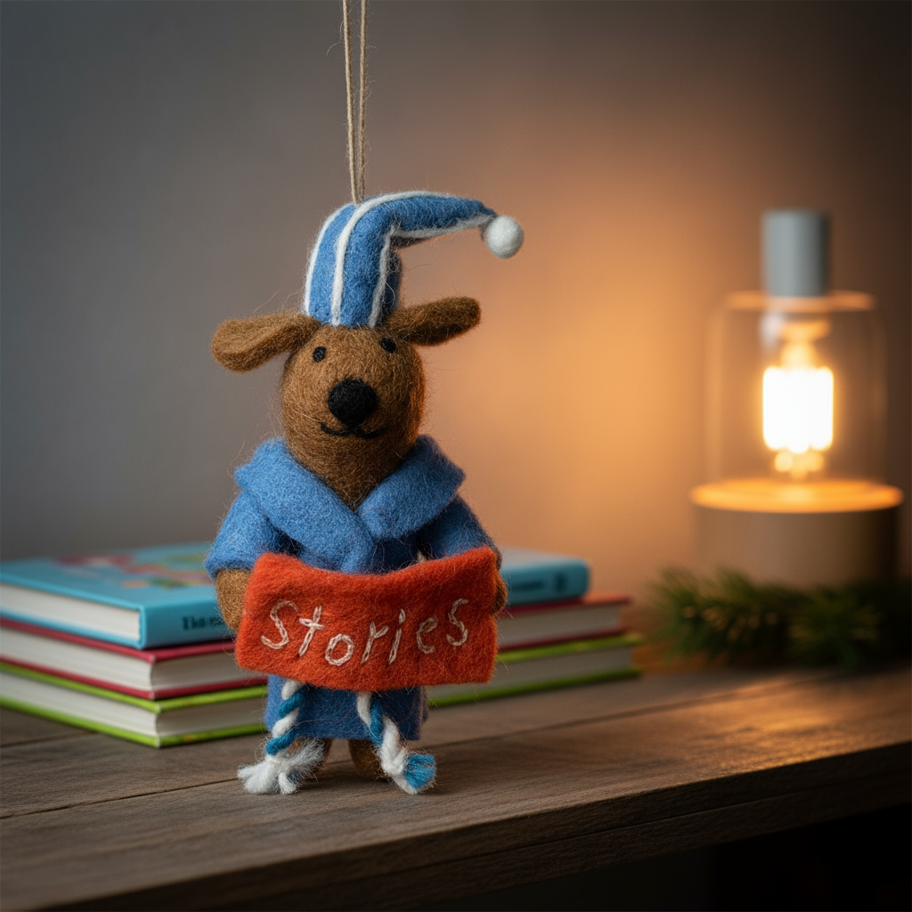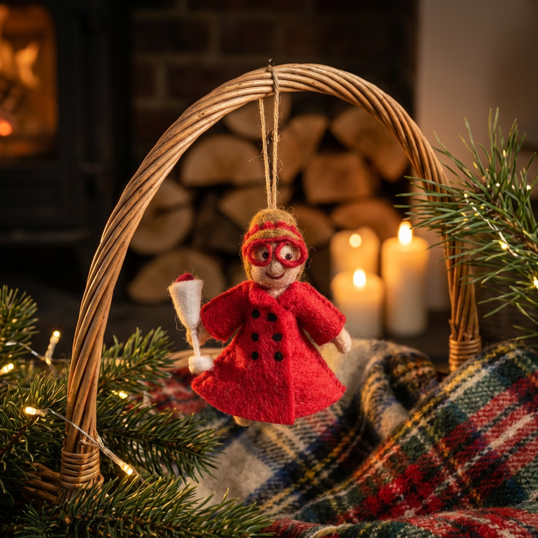 Voici Bruce l'Ours, le compagnon saisonnier le plus câlin. Réalisé à partir de techniques de feutrage à l'aiguille, avec de la laine de mouton bouclée naturelle pour sa fourrure brune et une expression adorable feutrée à l'aiguille. Son pull douillet bleu glacier a été confectionné à la main en combinant feutrage à l'aiguille et détails brodés. Bruce a été créé dans l'Himalaya dans des conditions de travail équitables en utilisant des matériaux durables et biodégradables.