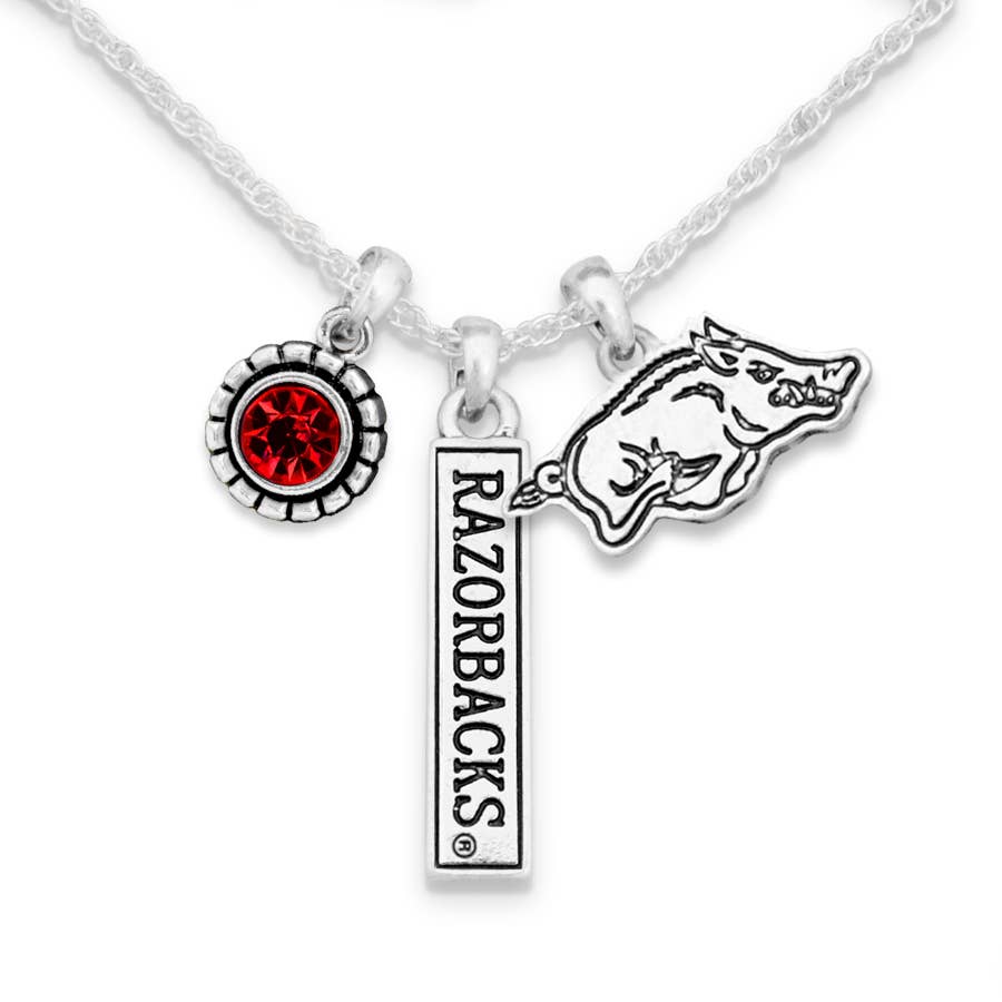 D'une longueur de 34 pouces, ce collier au fini vintage et à mèches de perles est orné d'un pendentif en forme de disque de bois avec logo Arkansas. Le pendentif mesure environ 1,5 pouces de diamètre. Il s'agit d'un produit sous licence officielle.