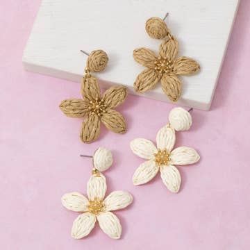Boucles d'oreilles à pompons en rotin à fleurs faites à la main en vente B2B