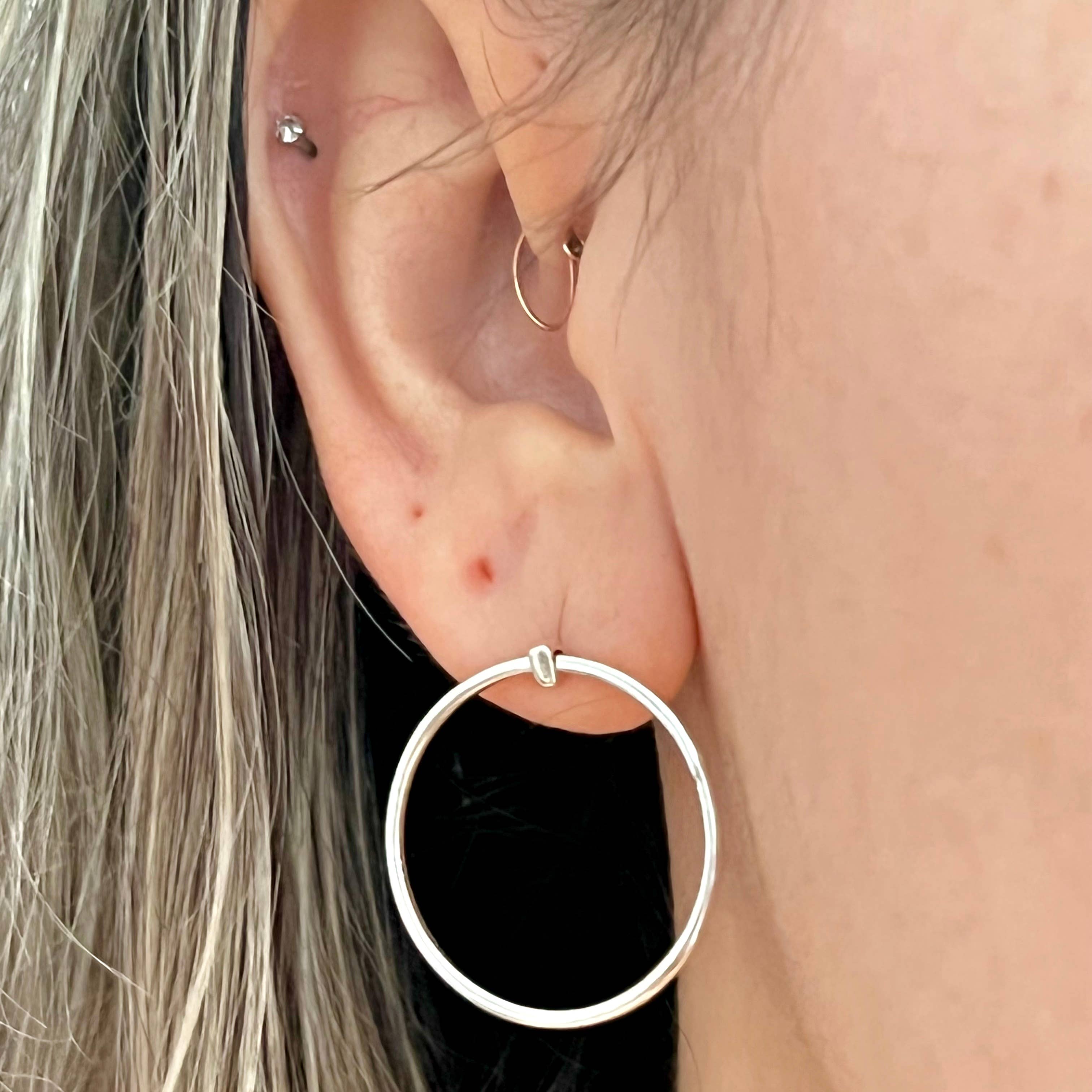 Nos boucles d'oreilles à tige en forme de petit cercle faites à la main sont élégantes et minimalistes. - Cercles remplis d'or 14/20 de 4 mm soudés à des poteaux en argent sterling .925, fixés par des écrous d'oreille en argent sterling et des bouchons en caoutchouc - Fabriqué à la main par The Land of Salt à Salt Lake City, UT