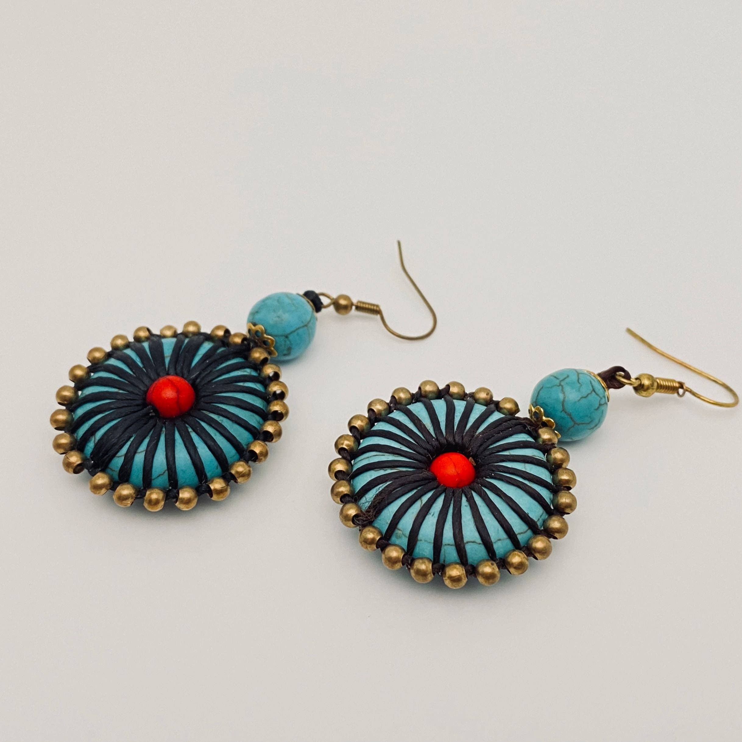 Ces magnifiques boucles d’oreilles fleurs en perles pressées sont fabriquées avec des perles de verre provenant de la République tchèque. Il s’agit de perles plates en forme de pièce, agrémentées de cristaux et de verre. Les couleurs sont superbes, et ces boucles d’oreilles de 4,5 cm s’associent parfaitement avec les colliers longs fleurs #550.