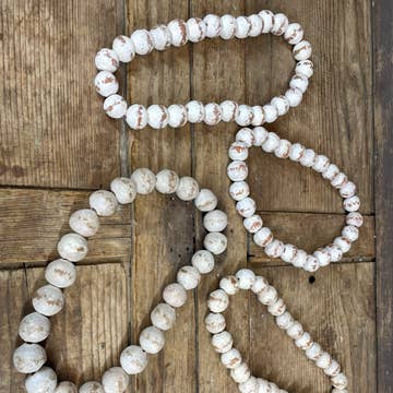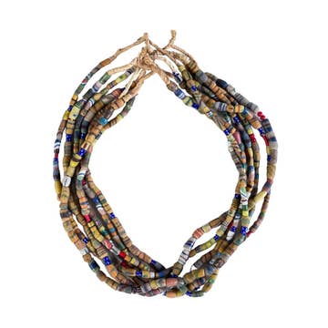 Découvrez ce magnifique brin de perles de sable blanc du Ghana, Afrique de l'Ouest. Le processus de fabrication de ces perles est unique à l'Afrique et est utilisé depuis plus de 1000 ans. Le verre pulvérisé de différentes couleurs est versé dans un moule en argile, en utilisant une tige de manioc pour le trou de la perle. Le moule est placé dans un four et chauffé jusqu'à ce que les particules de verre se congelent sans fondre et que la tige brûle. Les Ghanéens fabrique des perles de cette façon depuis les années 1600.