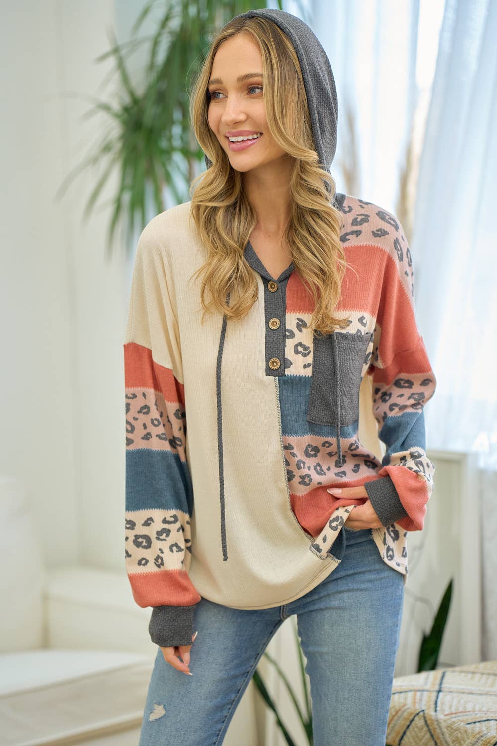 Sweat à capuche à manches rayées léopard avec cordon de serrage T4436