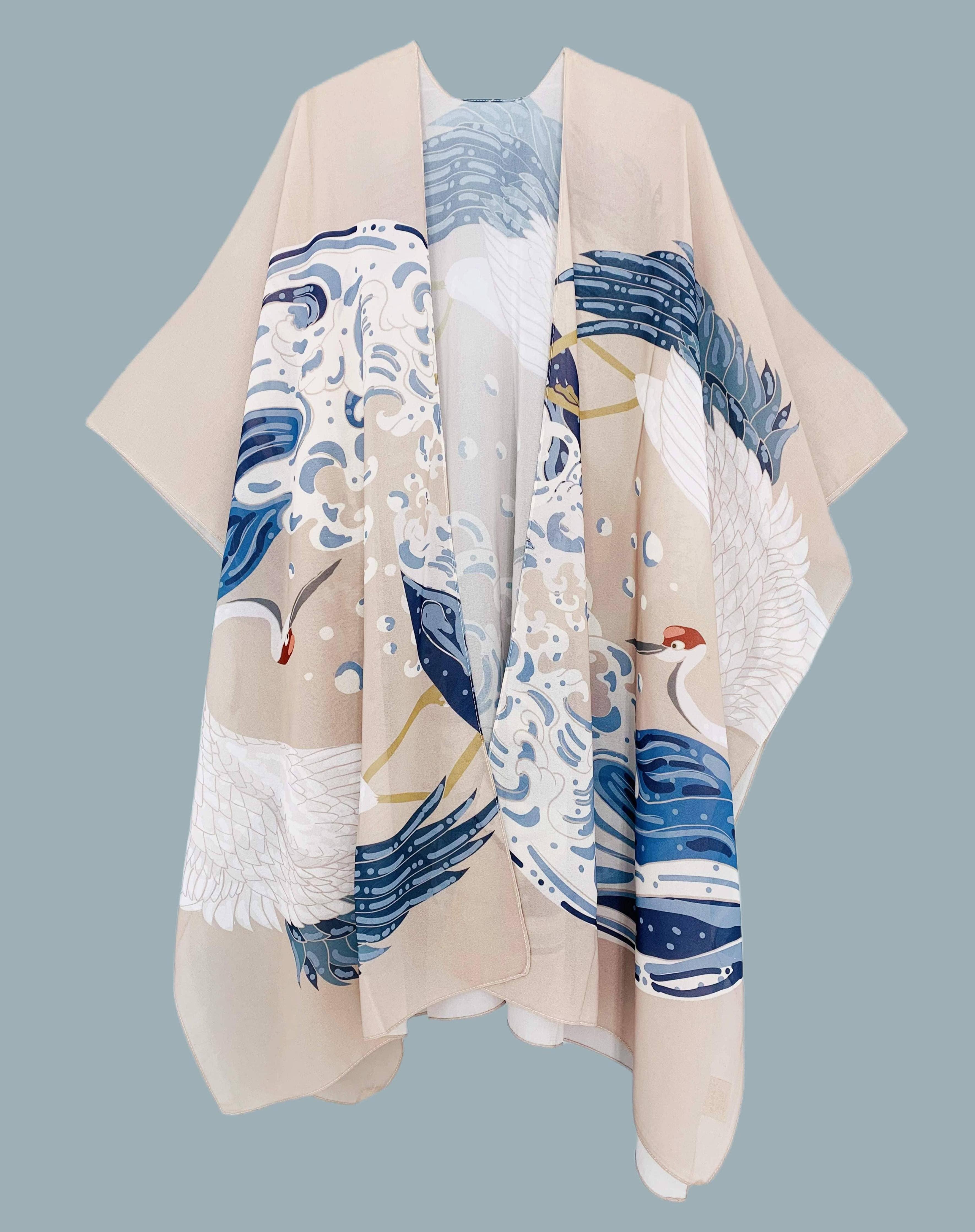 Ce kimono entièrement doublé de couleur bleu canard profond est une pièce maîtresse. Inspiré par Hokusai, l'ourlet présente des vagues ivoire brodées. La partie supérieure présente des oiseaux en origami ivoire brodés. La ceinture a des détails de broderie sur les extrémités. Portez-le avec un jean, un short ou par-dessus une robe, ou portez-le comme une robe de chambre à la maison. Ce kimono est super polyvalent pour ajouter un style infini à n'importe quelle tenue. Taille : Taille unique convient à la plupart (UK 8-18). Longs kimonos : De la nuque à l'ourlet 122 cm, Poitrine 116 cm, Manche 36 cm Tissu : 100 % Viscose Entretien : Nettoyage à sec uniquement. Cela préservera la beauté de votre kimono pendant des années.