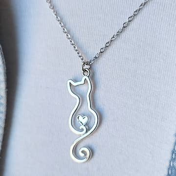 Un chat articulé en argent nickel avec des griffes en cuivre et une queue pendante glisse et se balancent sur un collier câble de 18 po avec fermeture aimantée.