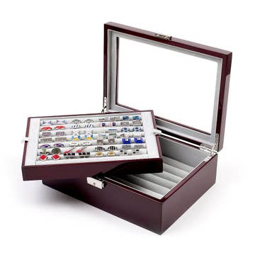 Boîte de rangement pour six montres et quatre montres de poche en bois noir mat avec plateau en verre et doublure en velours doux. Peut contenir 6 montres. Peut contenir 4 montres de poche. Couvercle à charnière. Couvercle à charnière. Doublure en velours doux. Couleur : noir. Modèle # BB704BLK