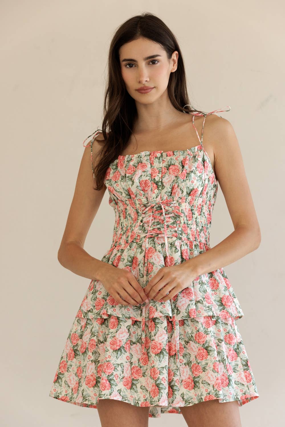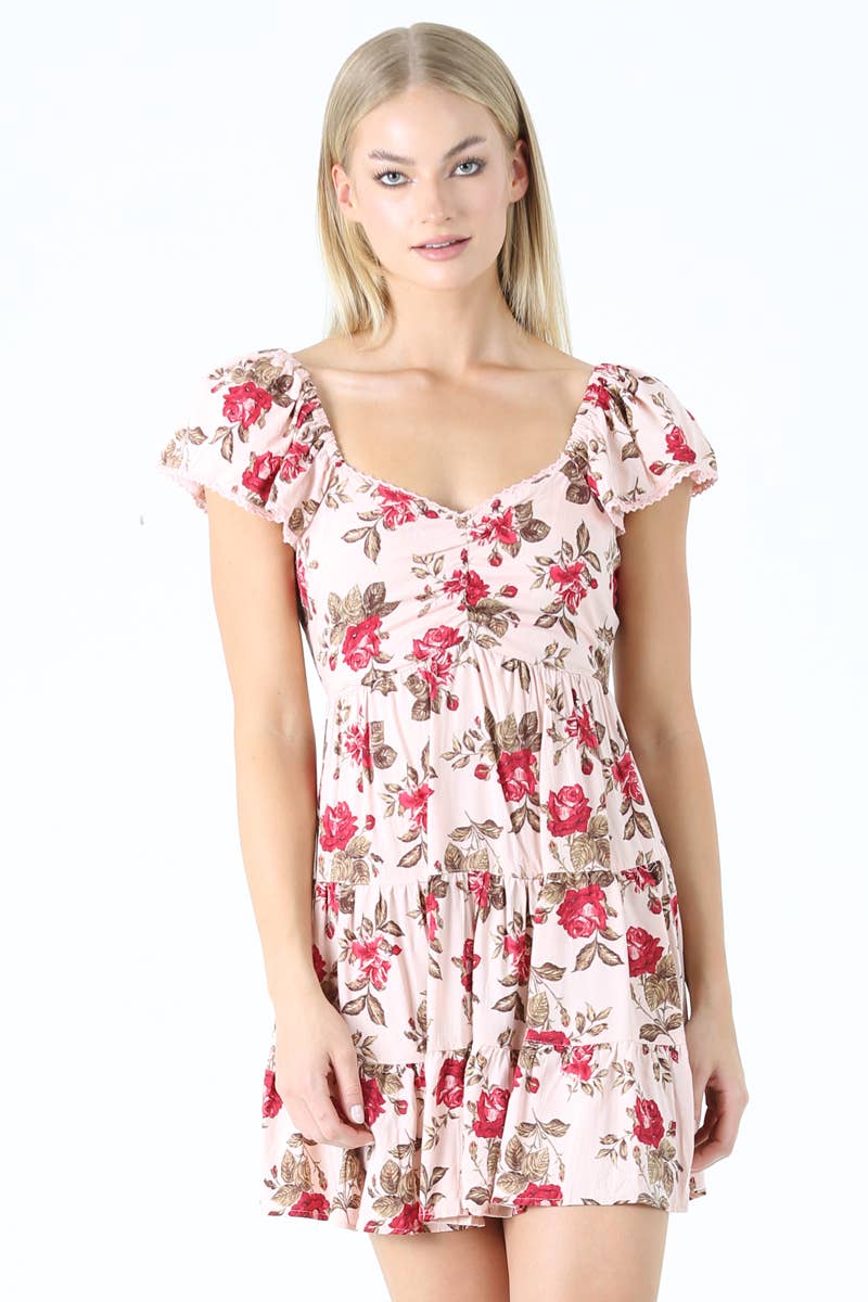 ROBE COURTE À VOLANTS ET ÉTAGES FLORALE PÂLE ENCOLURE CŒUR EN VENTE B2B