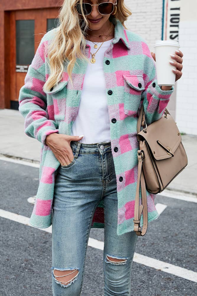 Manteau long en sherpa à carreaux - Deux poches poitrine avant - Fermeture à boutons 100 % POLYESTER
