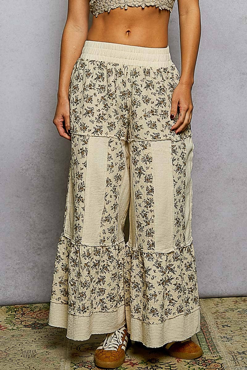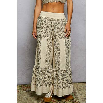 Style : AP9155 Pantalon large en lin doux imprimé avec ceinture élastique à nouer et poches latérales, en viscose et lin. Fabriqué en Chine.