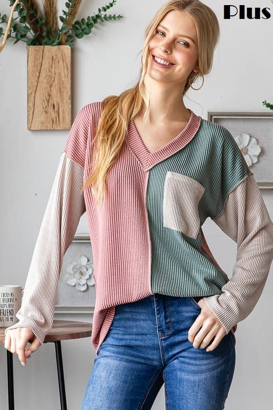 Haut à manches longues à col en V en maille torsadée et à blocs de couleurs T5694