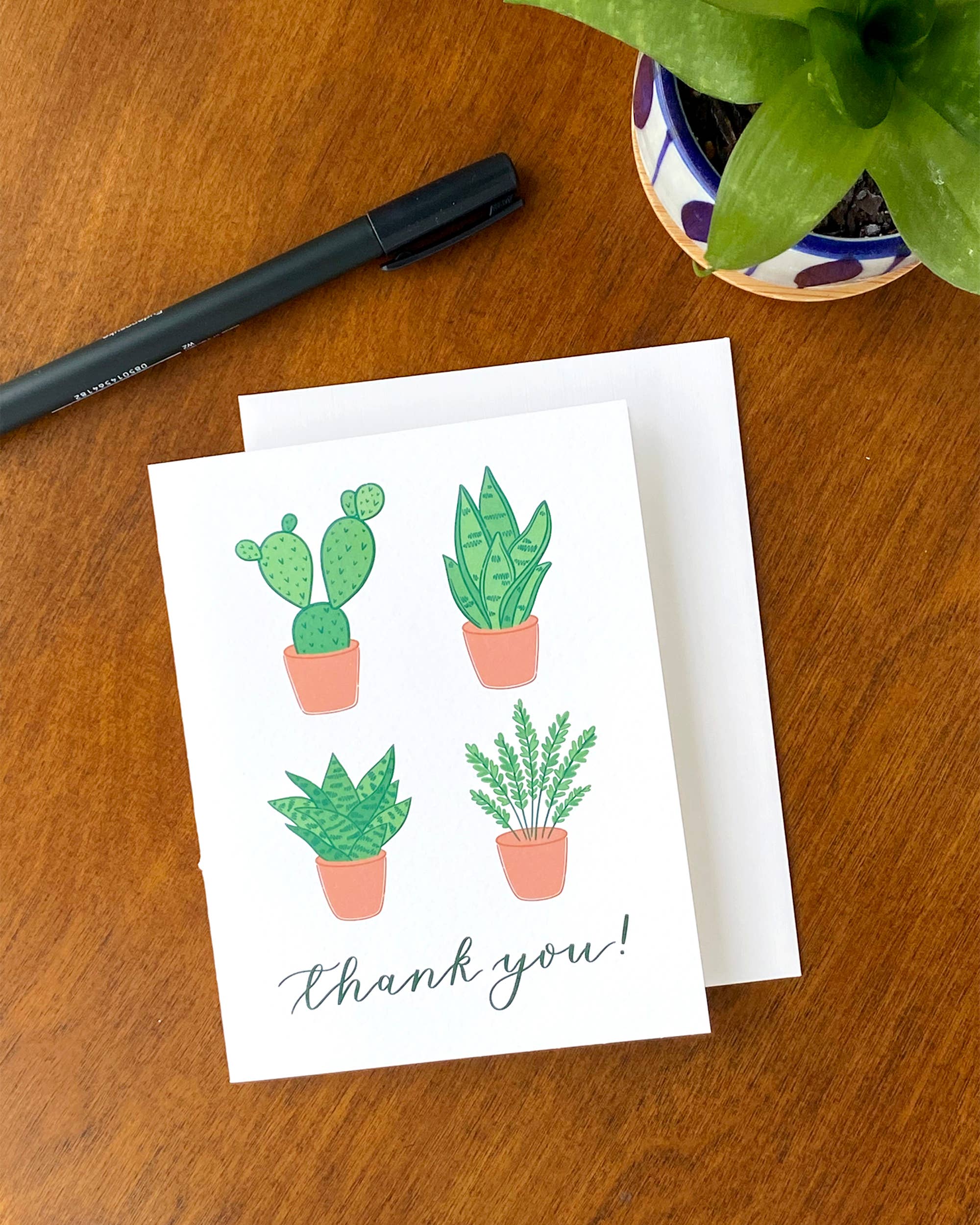Notre carte de remerciement Cactus Sunset présente un paysage de cactus serein illustré à la main sur un fond rose chaud, évoquant la sensation d'un coucher de soleil dans le désert. Carte pliée A2 (4,25"x5,5") | Carte en couleur et feuille d'or | Intérieur vierge | Enveloppe crème | Fabriqué aux États-Unis ©Antiquaria 2019