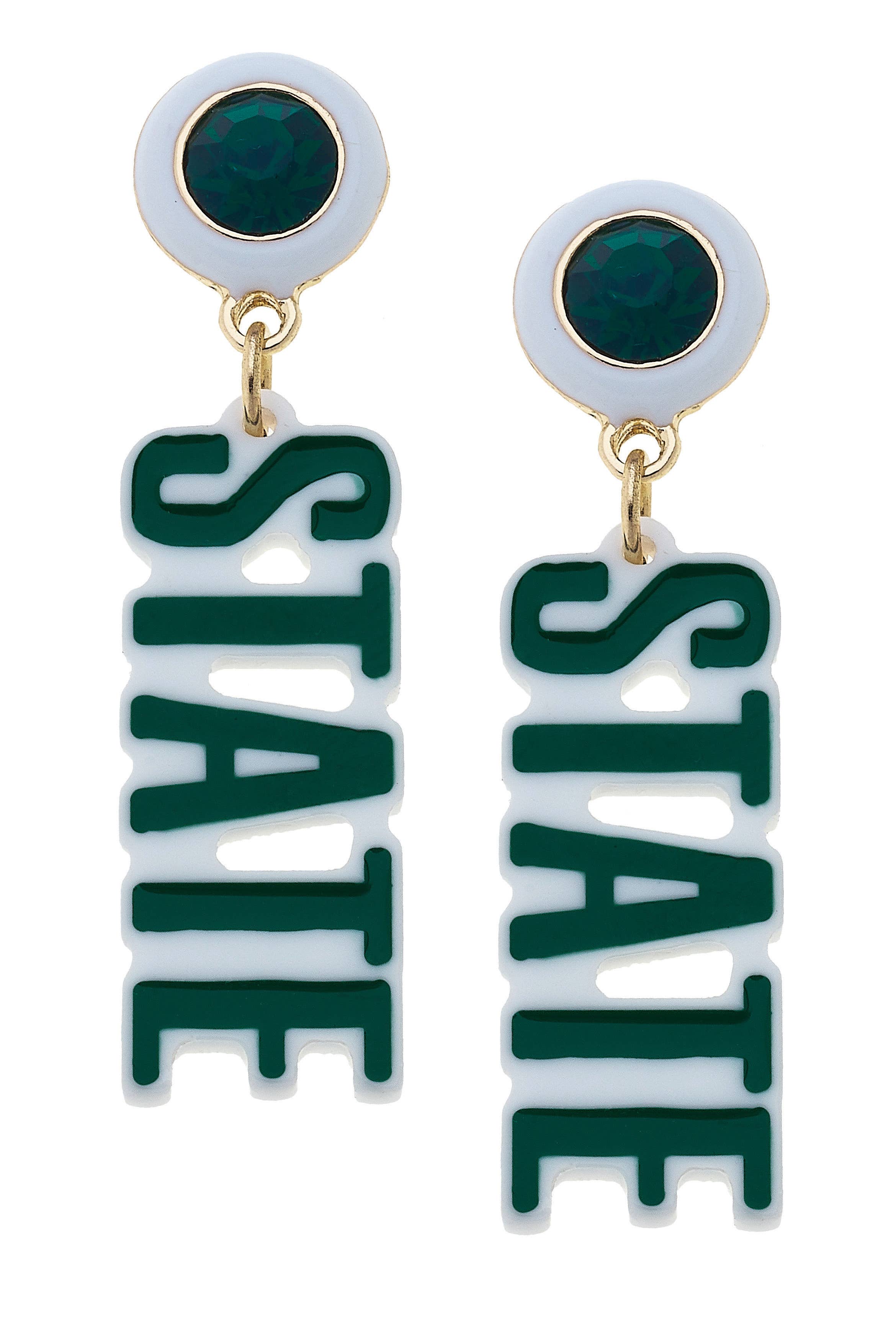 Boucles d'oreilles à tige en métal argenté avec émail vert avec le slogan « Go Spartans ». Il s'agit d'un produit sous licence officielle.