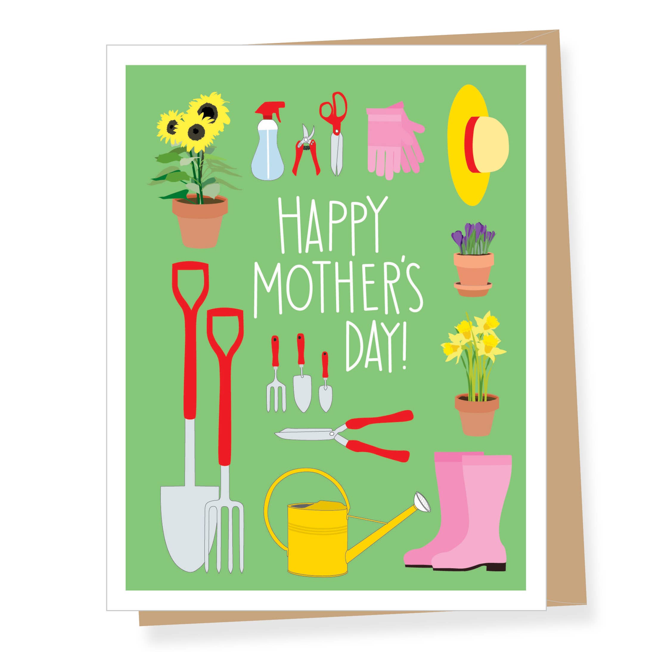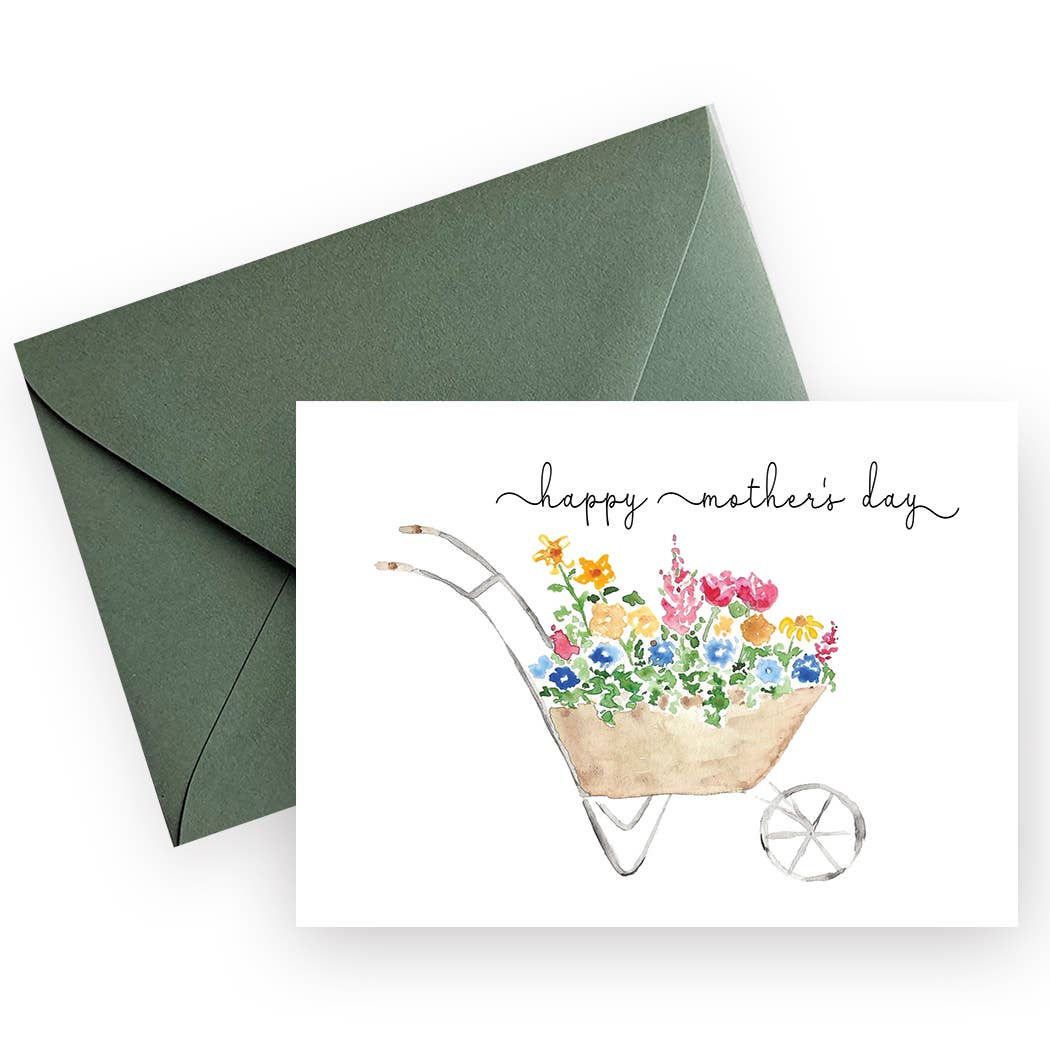 Lapin dans une brouette avec des fleurs et des bottes. Taille : 4,25 po x 5,5 po. Imprimé sur papier blanc cassé naturel et jumelé à une enveloppe kraft. Intérieur vierge pour message personnel.