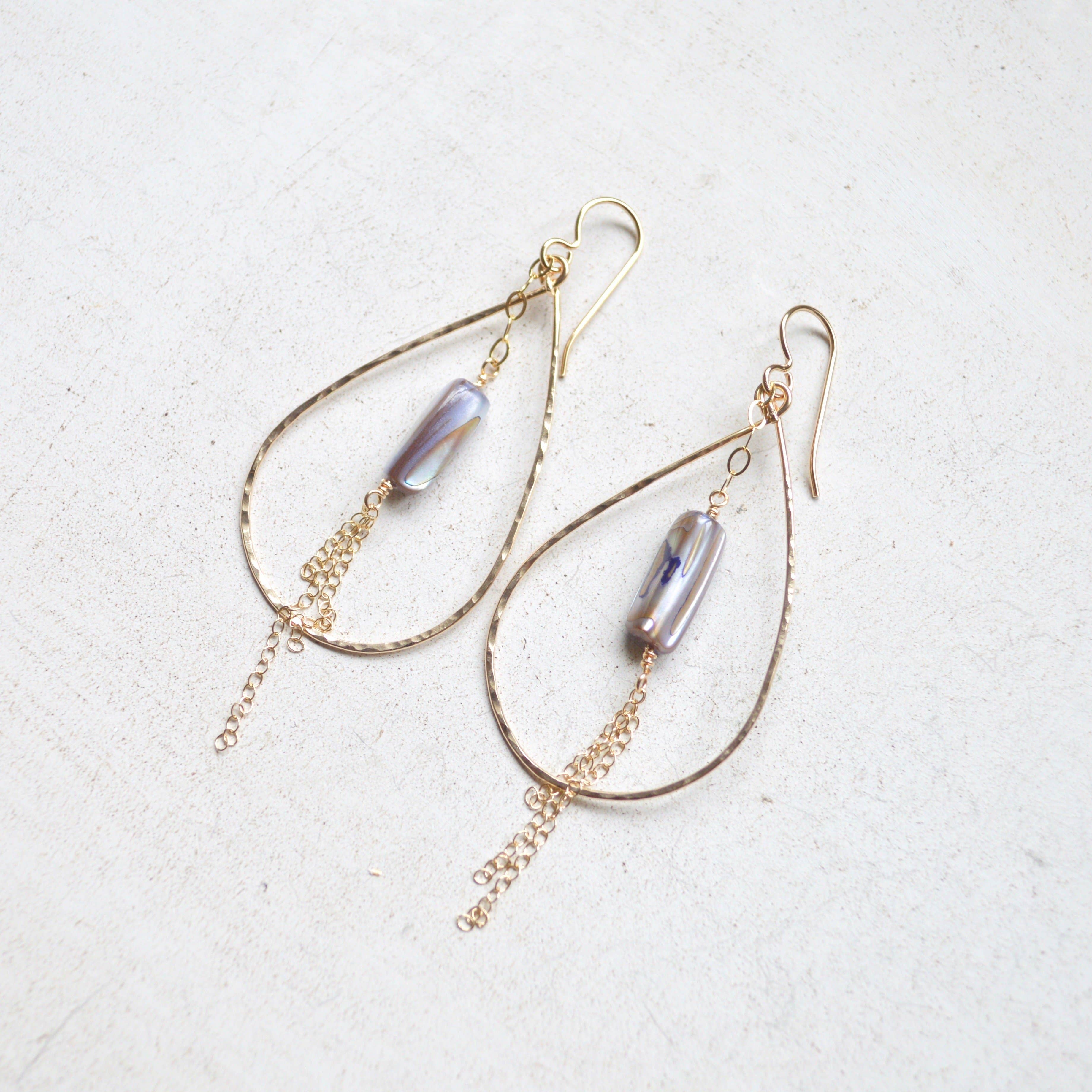 Ces boucles d'oreilles de qualité sont fabriquées avec de l'argent sterling, un rembourrage en argent, des perles d'eau douce et des cristaux Swarovski®. Cette liste concerne la combinaison neutre de perles blanches, de perles irisées, d'indigo foncé, de diamant noir et de chrome clair. Cette liste concerne la combinaison de couleurs neutres de cristaux et de perles Swarovski®. Chaque pièce est fabriquée à la main par des femmes réfugiées syriennes qui vivent ici à San Diego.