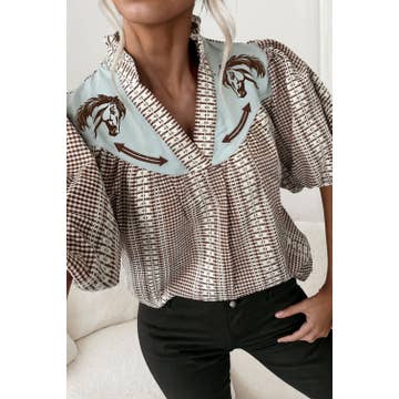 T1436-Haut licou à col en V à imprimé Western Comic en vente B2B