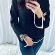 Pull à col en V avec manches patchwork à blocs de couleur imprimé léopard Matériau : 52% Viscose + 26% Polyester + 22% Polyamide Tableau des tailles (POUCES) Taille Buste Ourlet Épaule Longueur S 40.2 33.9 20.5 23.2 M 42.5 36.2 21.7 24.0 L 44.9 38.6 22.8 24.8 XL 48.0 41.7 24.4 25.6
