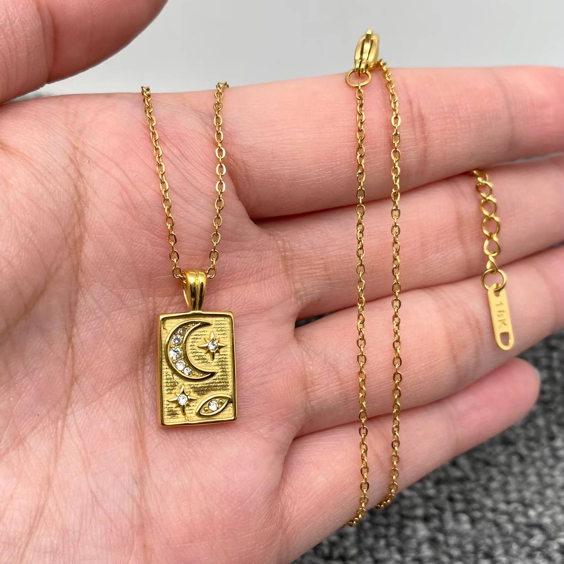 Ce collier d'affirmation est livré avec un pendentif en forme de croissant de lune et un autre pendentif en forme de cœur avec l'inscription « I AM ONE OF A KIND » gravée au dos. Hypoallergénique Sans nickel ni plomb Anti ternissement Résistant à l'eau Matériau/Taille Matériau : acier inoxydable 316L avec placage en or PVD 18 carats (10 fois plus épais que le placage à l'or ordinaire) Longueur de la chaîne : 18 pouces plus extension de 2 pouces Pendentif en forme de croissant de lune : 13 mm Pendentif en forme de cœur : 14 mm par 8 mm