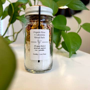Sel de bain magnifiquement parfumé dans un bocal en verre avec un couvercle en liège et une cuillère en bois Produit fait main utilisant uniquement les meilleures huiles essentielles et plantes Ttaille-8oz Bain Parfum Lavande + Rose