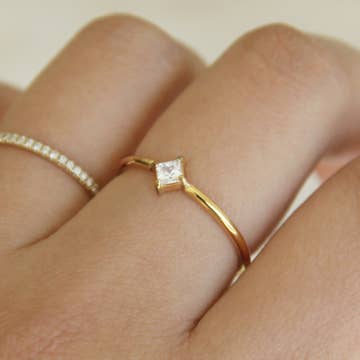 Bague solitaire carrée empilable en or 18 carats gold filled, avec un anneau de 1,5 mm de large et une pierre en zircone cubique carrée de 5 mm sertie. Parfaite pour être portée avec d'autres bagues. - Métal : or 18 carats gold filled - Poids : 1,8 gramme - Largeur de l’anneau : 1,5 mm - Pierre : 5 mm - Bijou hypoallergénique - Fabriqué à la main au Brésil