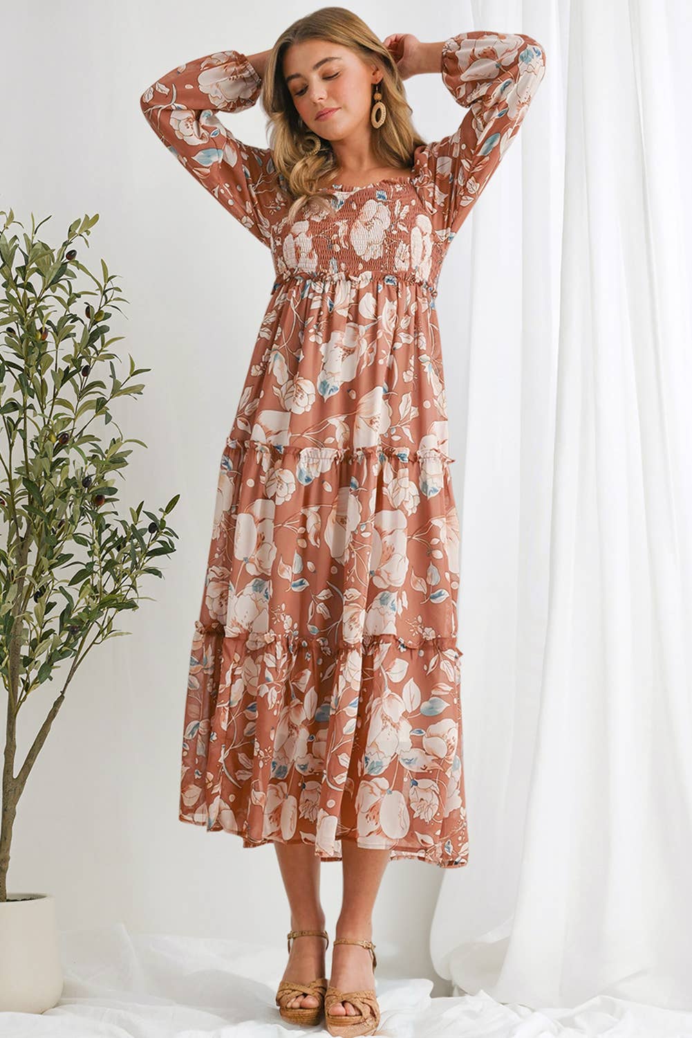 Robe maxi à volants diagonaux et smocks avec imprimé fleuri en vente B2B