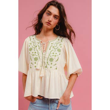 Ce haut paysan brodé floral élégant est fabriqué à partir de 100 % coton et dispose de manches 3/4, d'un encolure dégagée avec une cravate à pompon et d'une belle broderie vibrante. Style : haut. Matière : 100 % coton Dimensions : 27" du haut à l'ourlet (prise d'une taille M). 5119-WHT/CHAUX