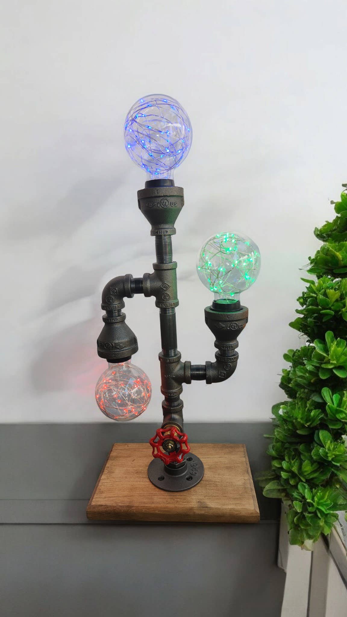 Belle lampe de table de style ancien avec : Compteur d'eau ancien Monté sur un socle en bois 3 sources lumineuses 3 abat-jour Indicateur de température de fonctionnement Interrupteur marche/arrêt de la vanne. Lampe fabriquée avec un tuyau en fer noir et des composants électriques homologués UL Livré avec 3 ampoules LED Edison L'industriel rencontre véritablement l'antiquité.