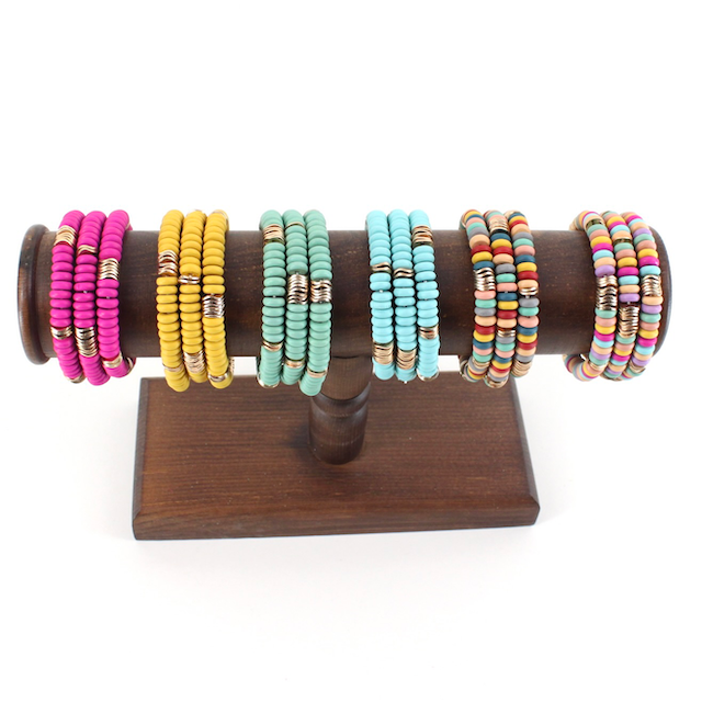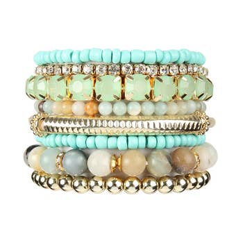 Meilleure vente pour la fête des mères ! Nos bracelets Aquamarine Roll-On® vous rappelleront l'eau fraîche même par une chaude journée d'été. Ce set de bracelets faits à la main incorpore les couleurs bleu-vert d'une pierre précieuse aigue-marine avec un peu d'or et de blanc pour faire ressortir les bracelets. Les bracelets aigue-marine peuvent également représenter les valeurs associées à la pierre précieuse aigue-marine telles que la jeunesse et le bonheur et constituent des cadeaux parfaits pour la fête des mères et les anniversaires ! - Le bracelet Original Roll-On® - Ensemble de 12 bracelets ; 6,50 $ par bracelet (78 $ pour l'ensemble de 12) - Environ 7” de circonférence - Fabriqué de manière éthique par nos artisanes au Népal - Perles de verre de haute qualité et fil de coton teint à la main - S'étend sur votre main pour s'adapter à la plupart des poignets - Aid Through Trade est un membre fondateur de la Fair Trade Federation et est le seul fournisseur autorisé de bracelets Fair Trade Roll-On®