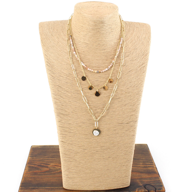 Ce bijou unique peut être porté de 5 manières différentes ! La fermeture magnétique vous permet d'ajuster cette pièce à votre goût. Vous pouvez le porter comme un long collier avec la partie inférieure composée de 3 rangs de magnifiques perles. Prenez la partie supérieure et portez-la comme un bracelet ou un collier ras du cou. Vous pouvez porter chaque pièce séparément ou ensemble pour créer un collier à 4 rangs. Les pierres peuvent varier en taille et en texture.
