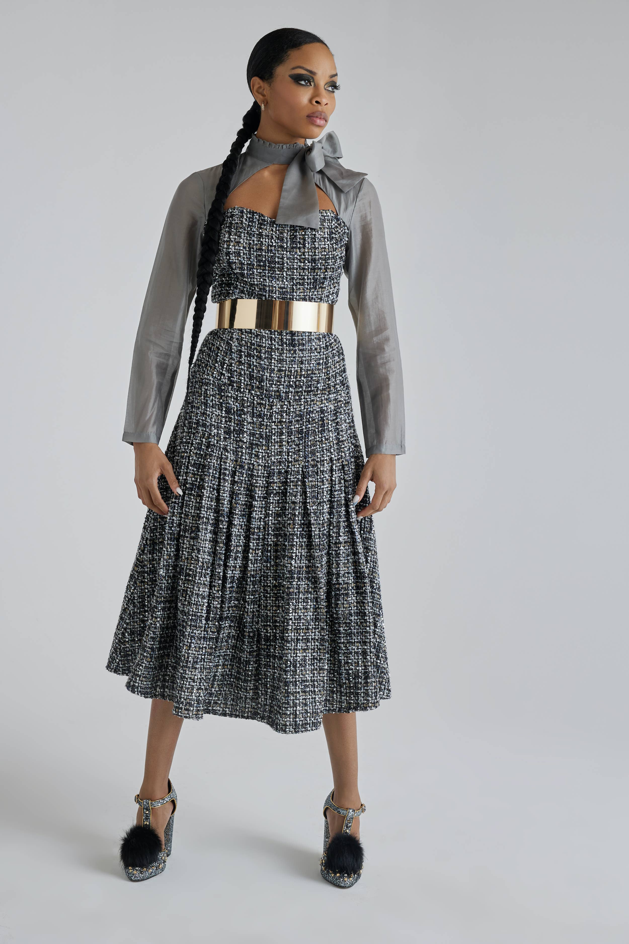 La robe asymétrique à rayures fines allie sophistication sur mesure et modernité. Conçue avec un corsage de chemise classique à col et des manches longues, cette robe présente des rayures verticales qui allongent la silhouette. Une fine ceinture noire cintre la taille pour plus de définition, tandis que l'ourlet asymétrique avec une fente haute sur la cuisse ajoute une touche audacieuse et contemporaine. Parfaite pour des transitions fluides du travail à la soirée, cette pièce incarne à la fois l'autorité et l'attrait.
