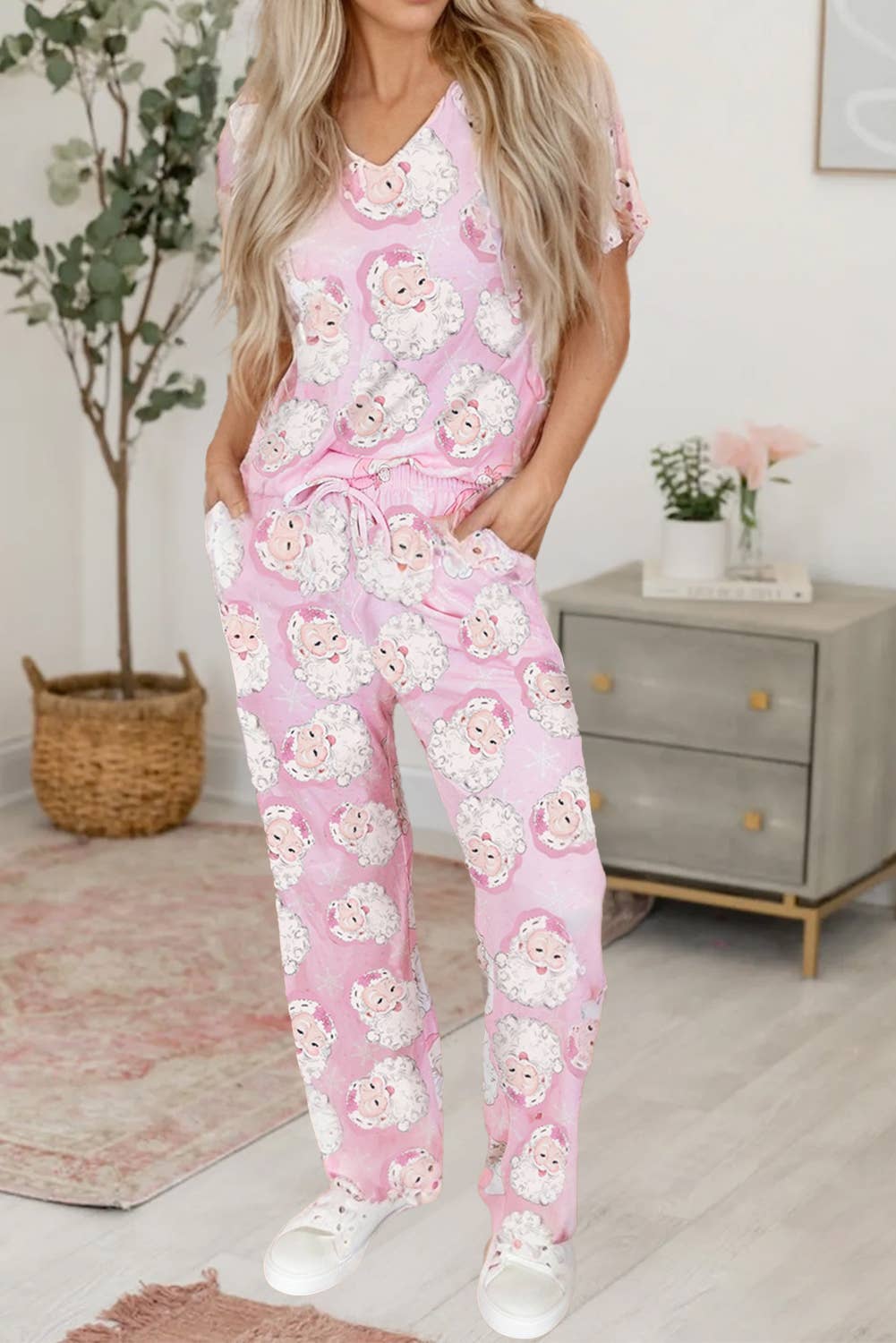 Ensemble de vêtements de détente confortables bleus avec bonnets de père Noël roses