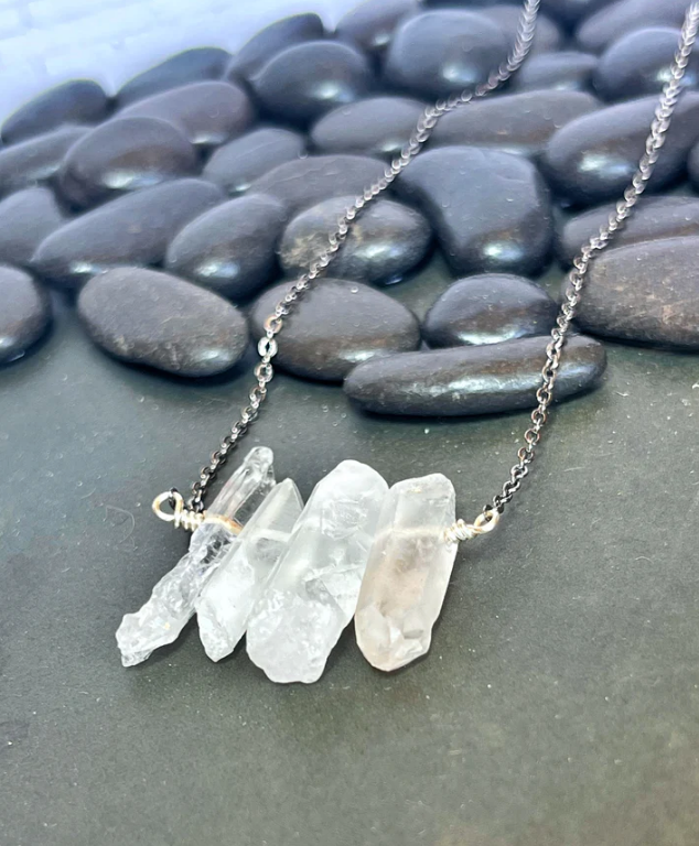 Collier à pointe de pierres précieuses brutes en quartz transparent ~ « Conscience spirituelle, clarté et puissance »