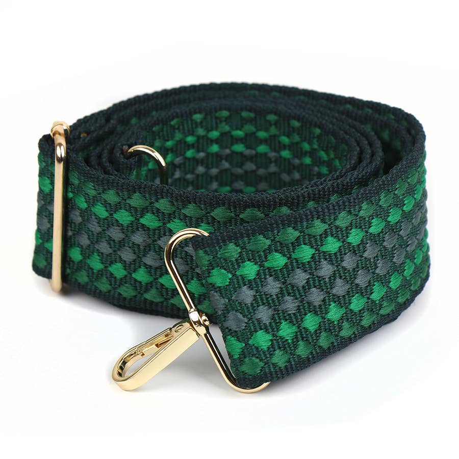 Sangle de sac interchangeable en tissu géométrique vert sauge, taupe et prune avec clips dorés.