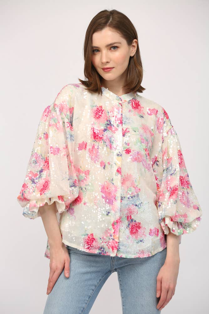 * ED24X310 * Blouse à imprimé floral avec col en satiné/patte de boutonnage CF, 1 cristal bouton attaché à la patte de boutonnage CF, cordon à nouer avec pompons perlés * Floral ivoire * Laver à la main à chaud avec des couleurs similaires * Séchage à la ligne * Tissu de base : 100 % coton, tissu contrastant : 100 % polyester