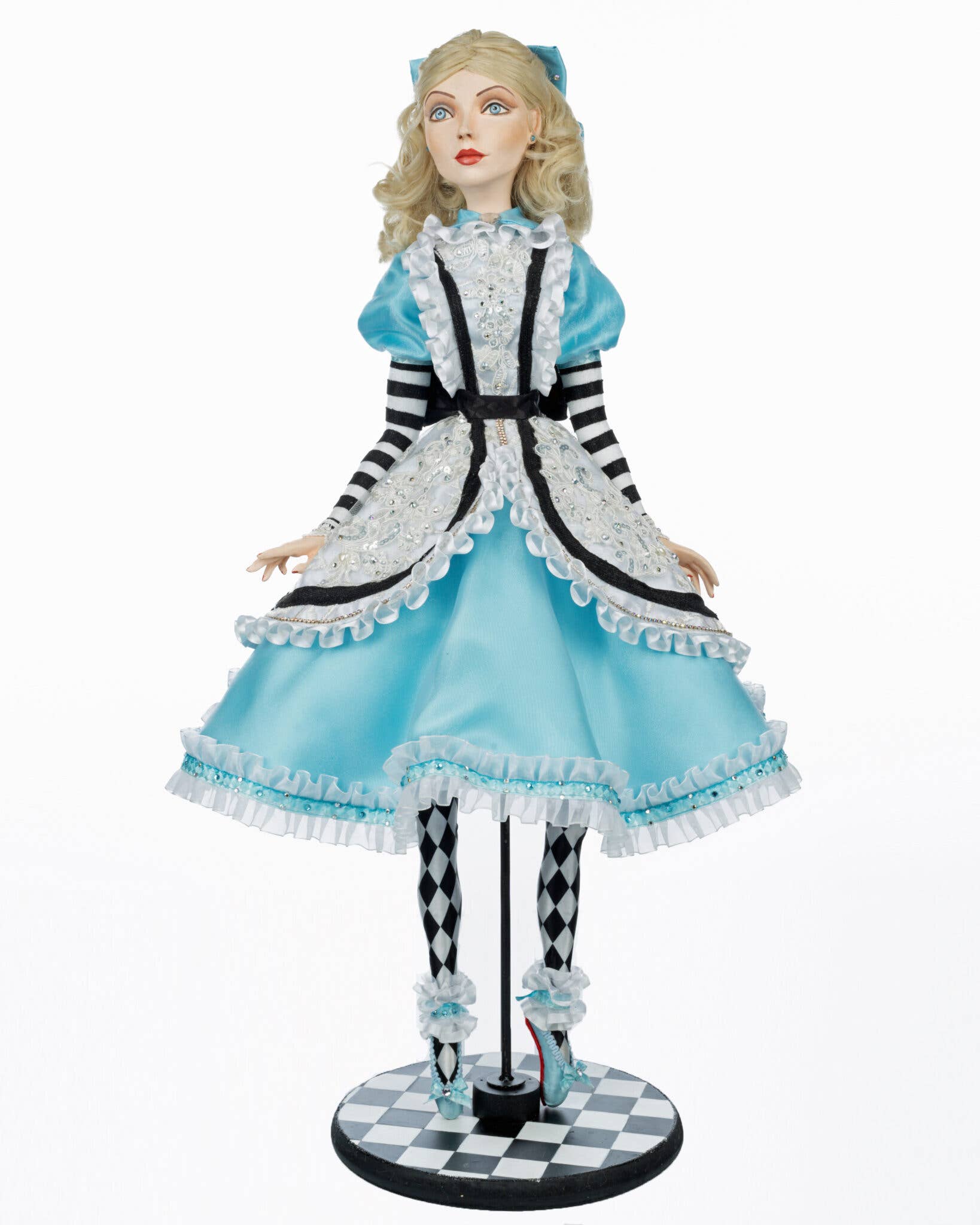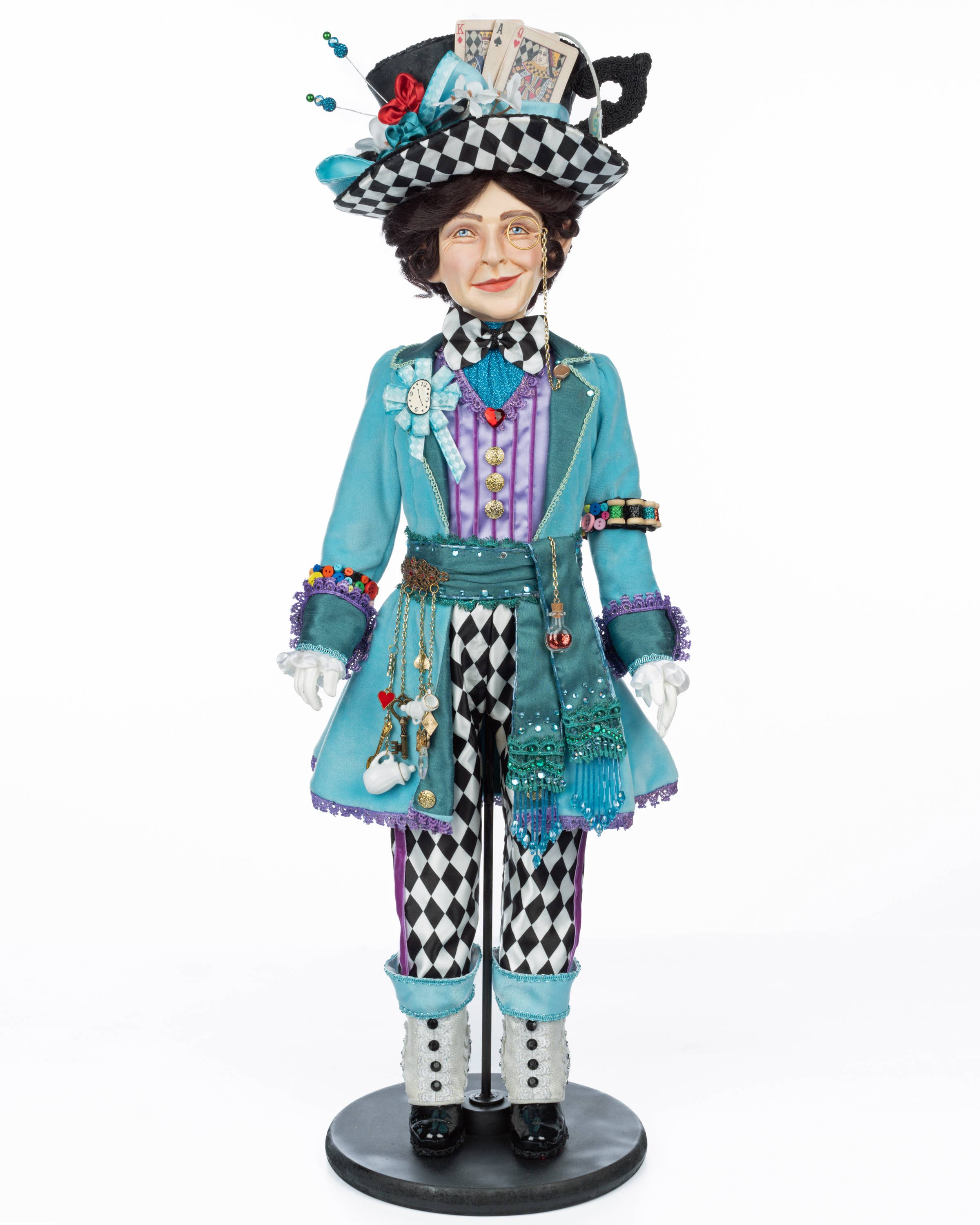 Bougeoir Mad Hatter. Décor de table en résine sculptée et peinte à la main. Des vêtements fantaisistes faits à la main ornés de bijoux, de breloques et de nombreux détails et garnitures charmants. Bougies à piles incluses.