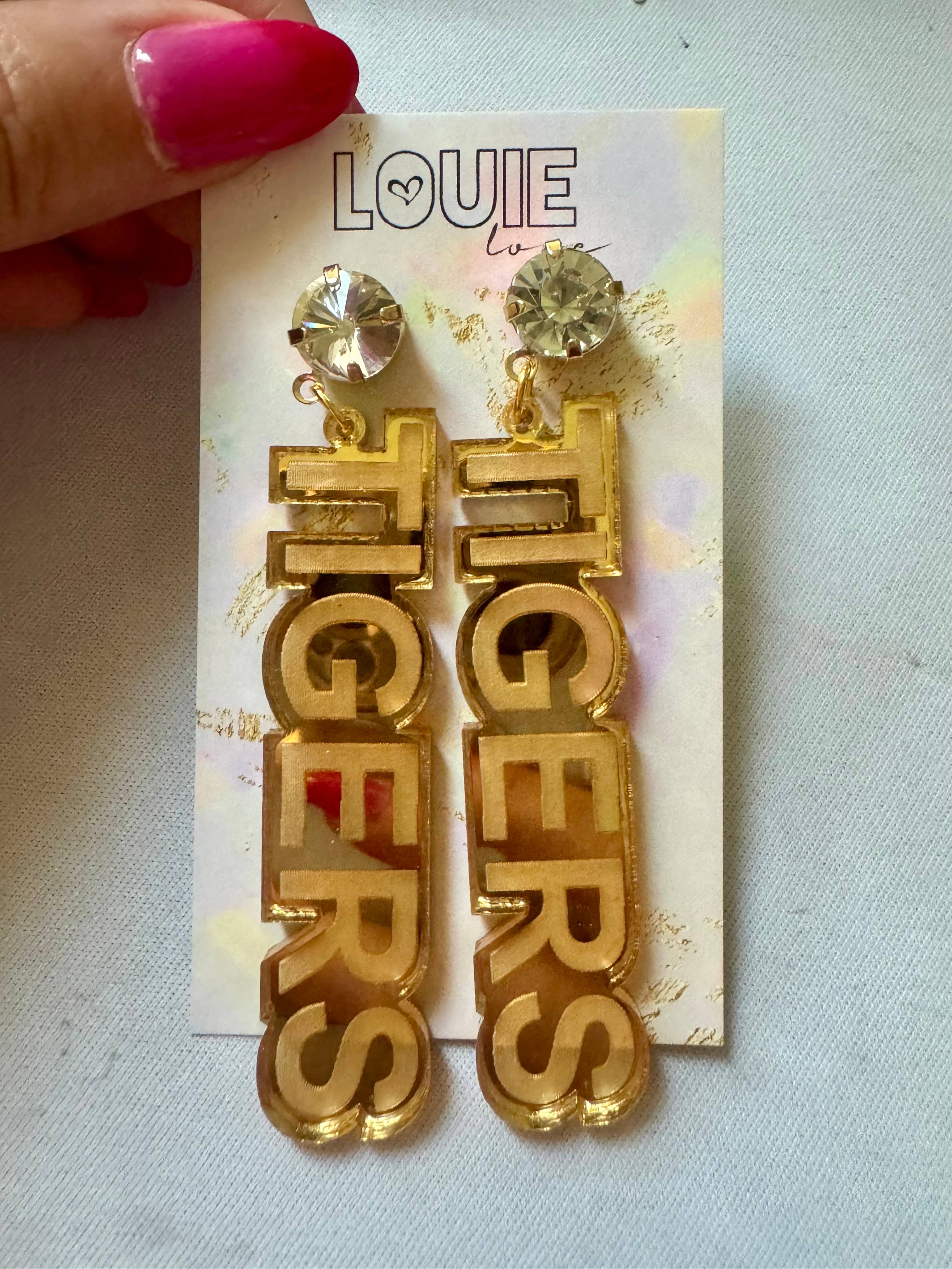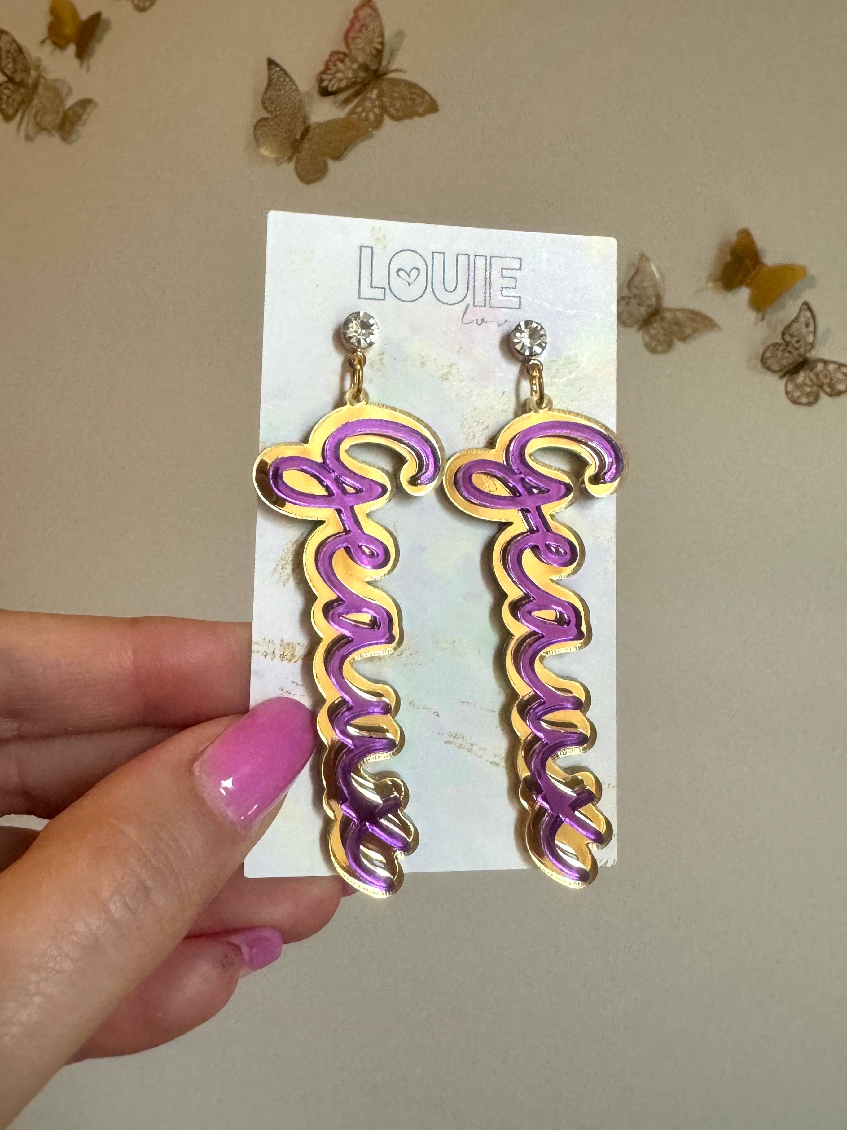 Exclusif Louie Love Miroir doré de 1/8 po d'épaisseur + acrylique gravé Grandes boucles d'oreilles en strass doré