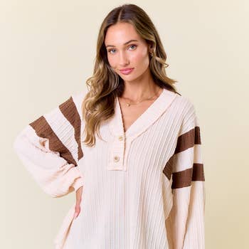 Pull à manches longues à col en V à rayures texturées : un mélange captivant de texture et de style pour votre garde-robe. Ce pull est orné d'un motif à rayures texturées et d'un grand col en V élégant, créant un ensemble chic et douillet.