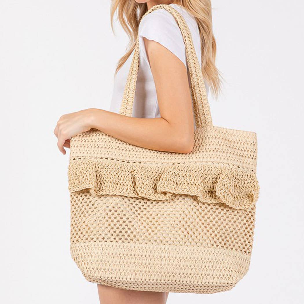 Sac cabas de plage en paille crochetée multicolore avec pompons et glands en vente B2B