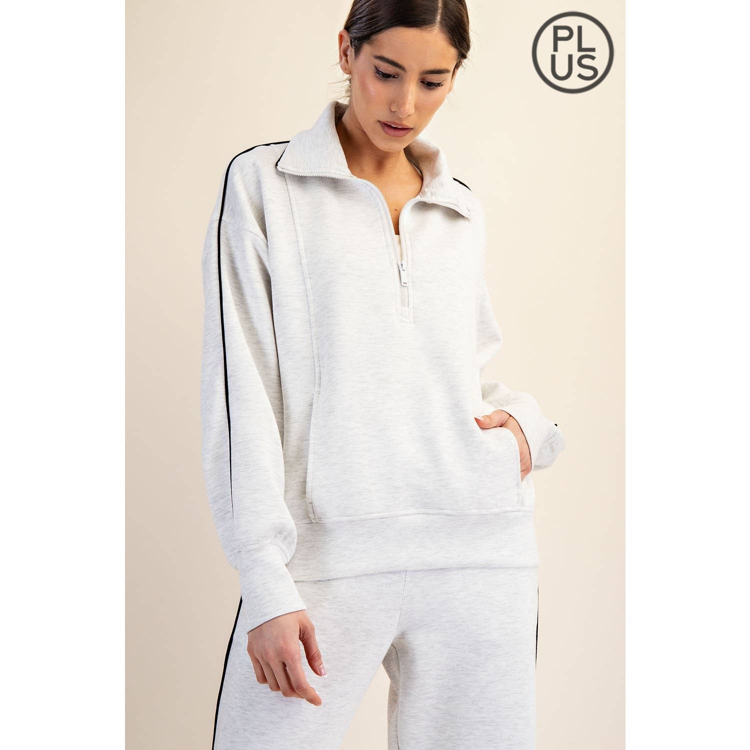 - Style n° : T0028 Obtenez un look luxueux et sportif avec ce pull à quart de zip, fabriqué dans un tissu rafraîchissant, léger et soyeux. Doté de détails de coutures et de passepoils, il offre le parfait équilibre entre confort et style. Caractéristiques : - Tissu Scuba Modal Poly Span - Tissu soyeux et léger - Extensibilité dans 4 directions - Coupe décontractée - Fermeture à quart de zip - Col montant - Épaules tombantes - Détails de passepoil - Poche kangourou Disponible également en taille Plus/Curvy 1XL-2XL-3XL Style n° : T0028PL Le mannequin mesure 1,73 m et porte une taille Small. Tissu : 48 % Modal, 45 % Polyester, 7 % Spandex P.O.D : Importé